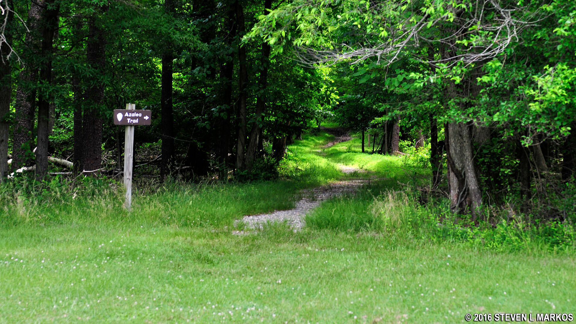 A tenth of a mile later is an intersection with a trail that proceeds up a short, moderately difficult hill and connects to the Laurel Picnic Area. It is also very narrow and flanked by grass, making it a potential tick gauntlet. Unless you have a reason to hike to the picnic area, pass this by and continue on the Azalea Trail.
