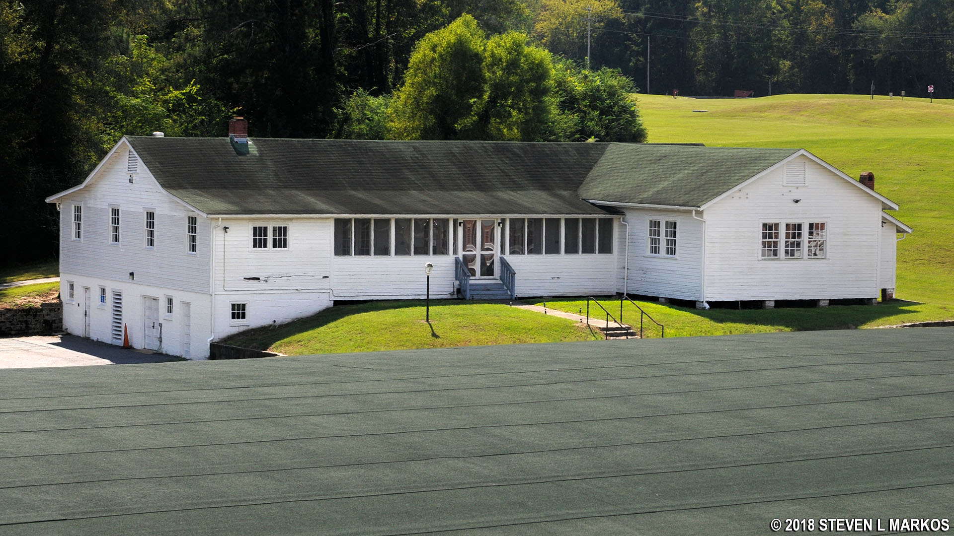 The first building you come to as you walk downhill along the paved path is the largest non-hangar structure at Moton Field, the Skyway Club. This was a recreation and dining facility built in 1945. It once served as a restaurant for park guests, but today it is a little dilapidated and is now closed to the public.