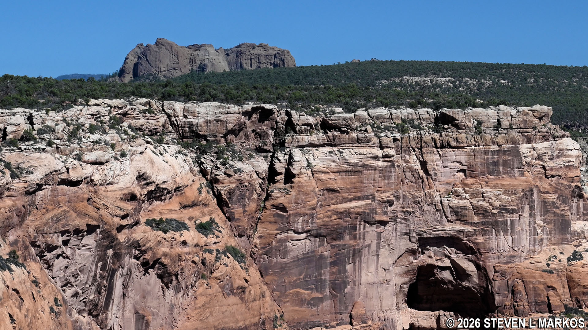 Also visible from the overlook is Black Rock Butte. It is a volcanic plug composed of minette that rose to the surface along the fault line below. Minette is a dark-colored, ultrapotassic igneous rock that originates from the deep mantle. Another example of this type of formation is Ship Rock in New Mexico, about sixty miles northeast, just across the border.
