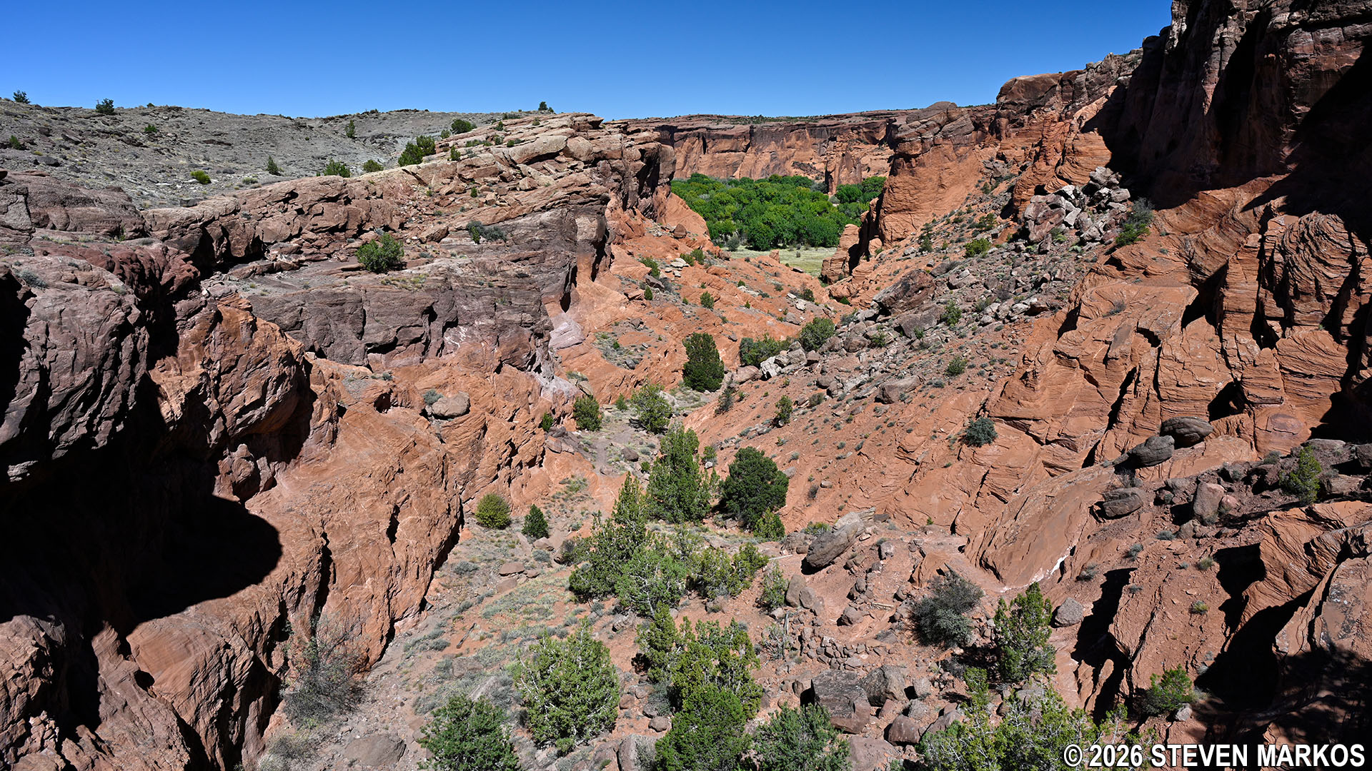 The first stop on South Rim Drive when departing from the Canyon de Chelly National Monument (pronounced de Shay) Visitor Center is the Tunnel Overlook. It offers a view into Tunnel Canyon, one of the many side canyons within the canyon system. This short, narrow section with walls only 300 feet tall feeds into Chinle Wash. The fallen boulders seen here are the result of the rapid flow of water millions of years ago that carried rocks and other sediment while cutting the canyon.