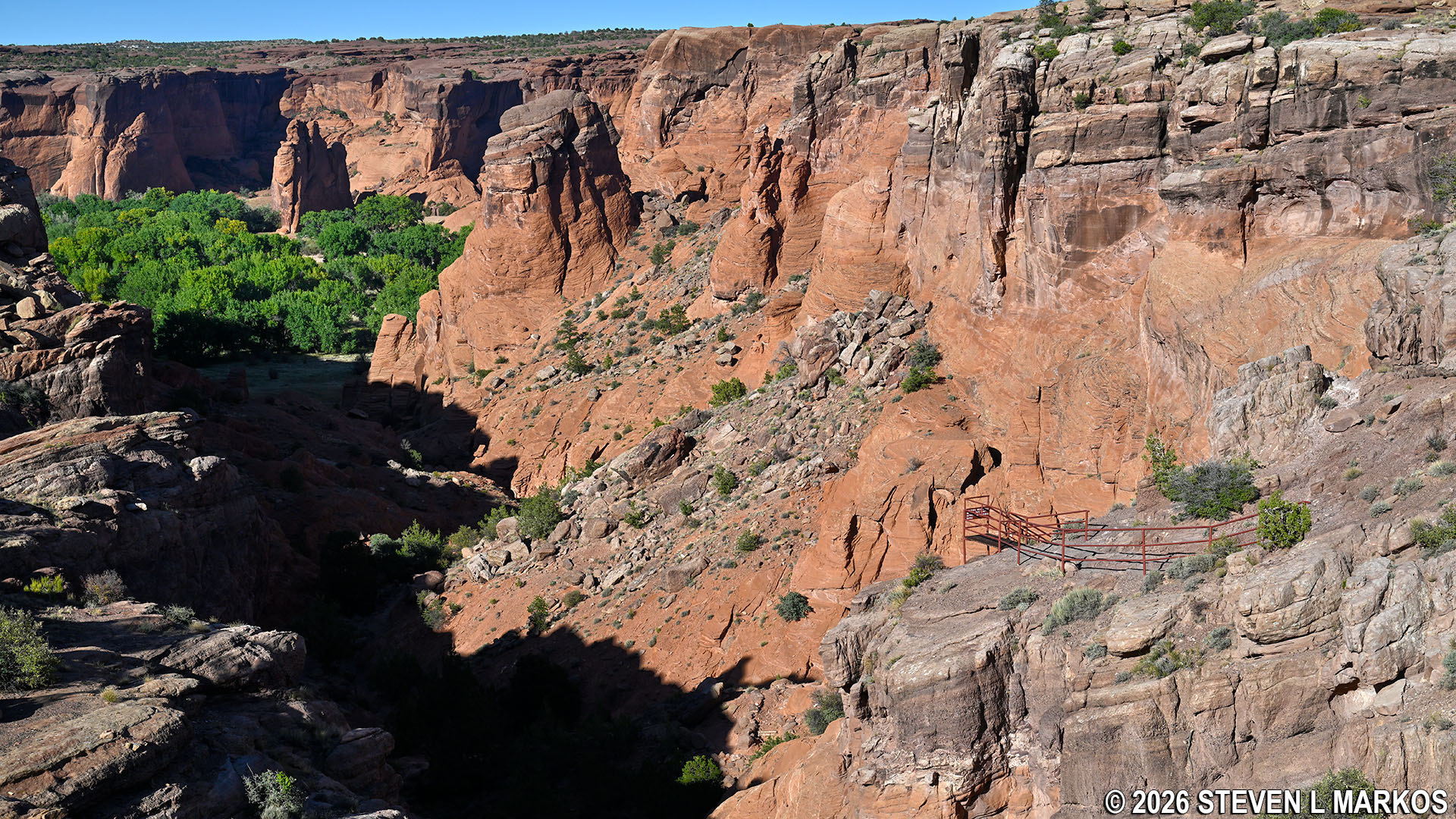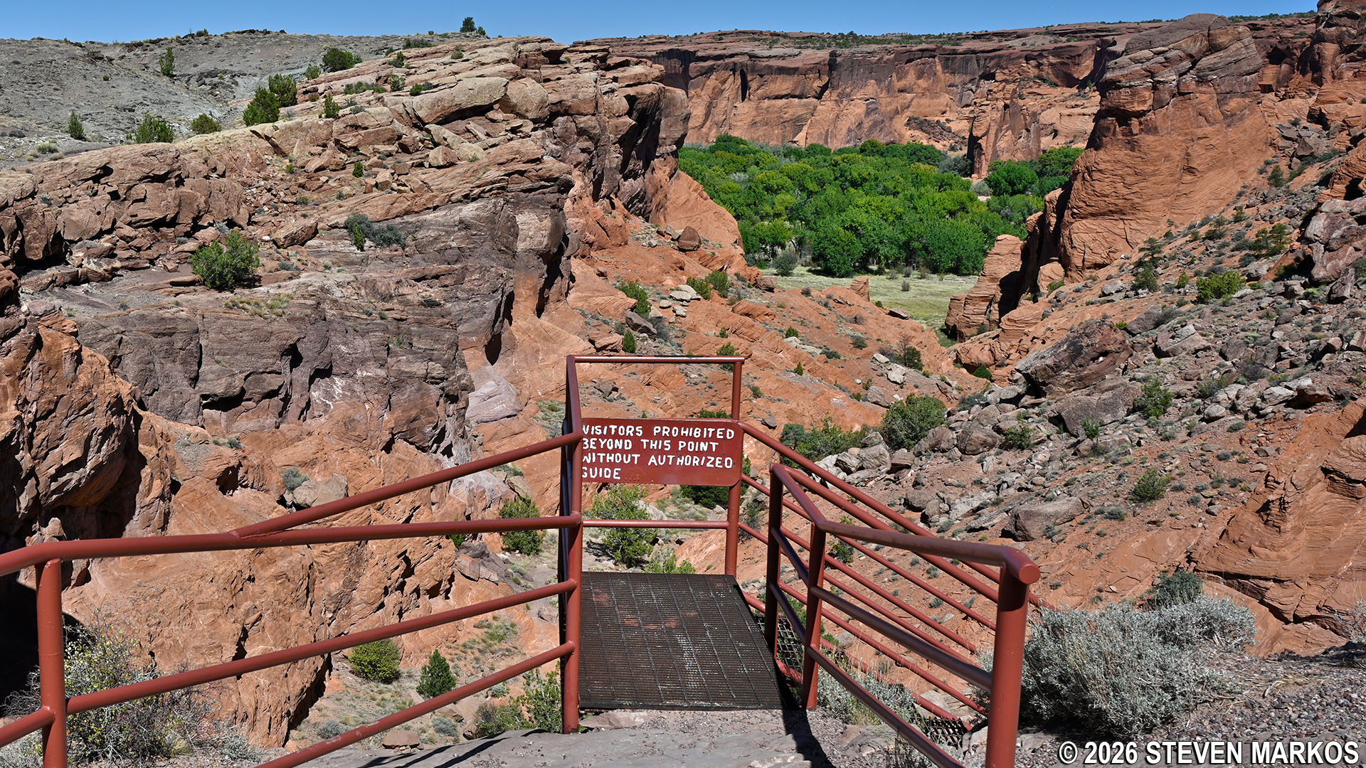 The only reason to walk down to the platform is to hike the Tunnel Trail, which starts here. The trail leads two-thirds of a mile down to the canyon floor, and from there you can hike to First Ruins (3.5 miles, round trip), one of the many archeological sites within Canyon de Chelly National Monument. However, any non-Navajo visitors must hire an authorized Navajo guide to venture any farther than the overlook platform. The only trail in the park that is open to anyone is the White House Trail located at the White House Overlook another four miles farther east on South Rim Drive.