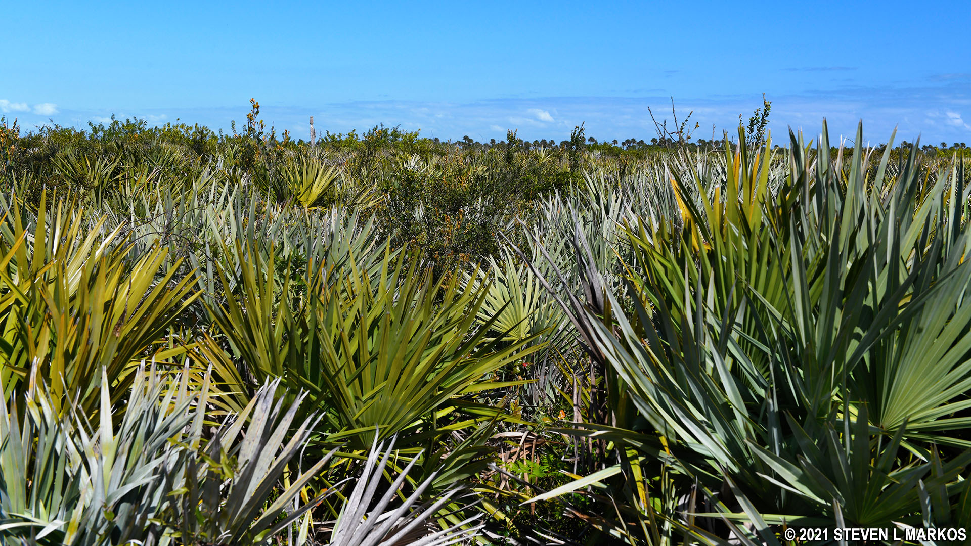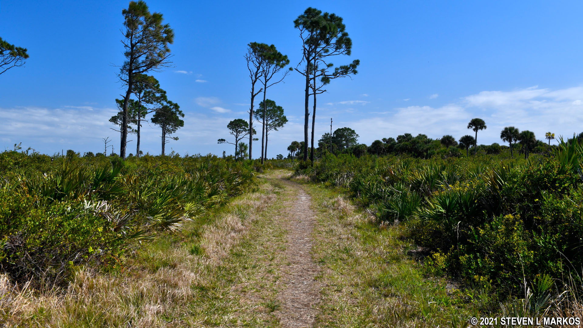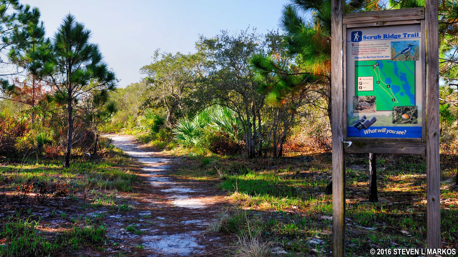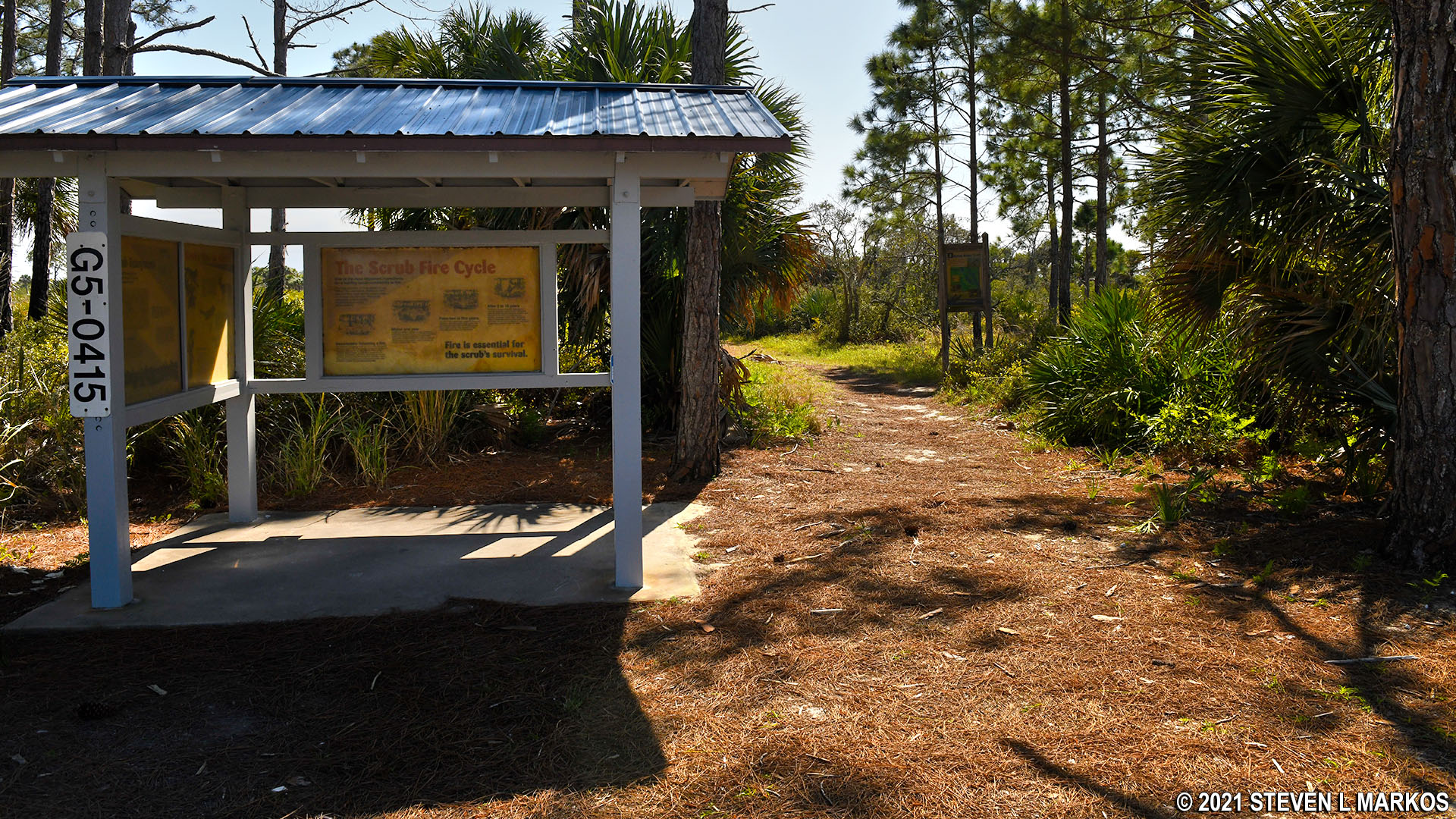 The Scrub Ridge Trail at Merritt Island National Wildlife Refuge forms a long and very narrow loop, so narrow that when you return you are no more than fifty yards or so from where you were when you started out on the hike. The two trailheads are on either side of a covered information kiosk. I started out on the trailhead to the right of the kiosk (the easiest to spot), which set me off hiking in a counterclockwise direction.