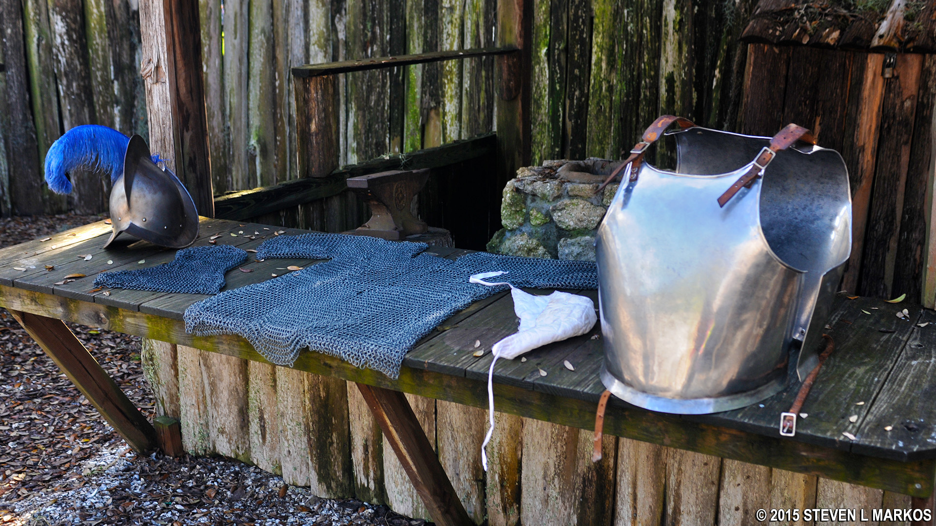 The camp now hosts 30-minute Living History demonstrations that are held Thursdays through Sundays at 10 AM, 11 AM, 1 PM, and 2 PM starting in December and running through mid-April. During the summer the weather gets too hot for outdoor activities on a daily basis. Park Rangers and volunteers dressed in period costume demonstrate such things as blacksmithing, native crafts and cooking techniques, and how to use the weapons of the 16th century. Different topics are covered at each demonstration. At other times you can walk around the village and talk with the Rangers and volunteers and even try on authentic Spanish armor. Keep in mind that times can always change, so before making travel plans be sure to visit the National Park Service’s official Operating Hours and Seasons web page for the De Soto National Memorial to get the latest schedule.
