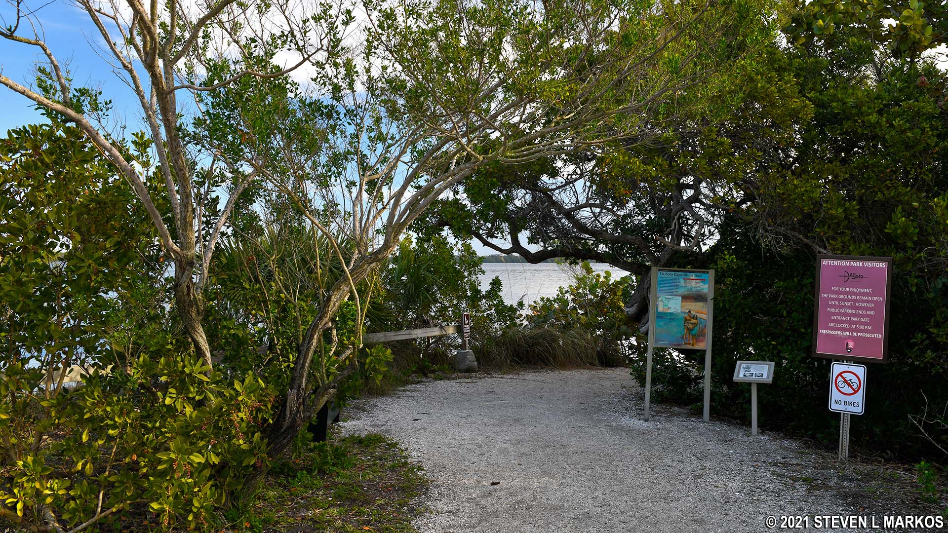 A second loop hike is a longer version of the Expedition Trail and covers 95% of this trail in the process. Instead of heading back to the Visitor Center it turns south and proceeds out of the park and into Riverview Pointe Preserve, then returns to the park via 75th Street. Though Riverview Pointe is owned by Manatee County, since being purchased in 2000 it has been run jointly with the National Park Service. Signs you see along the way are stamped with the NPS logo. I highly recommend this route because it follows more of the Manatee River shoreline and passes two monuments. What’s more, it is barely over a mile long. My trail report is of this longer hike.