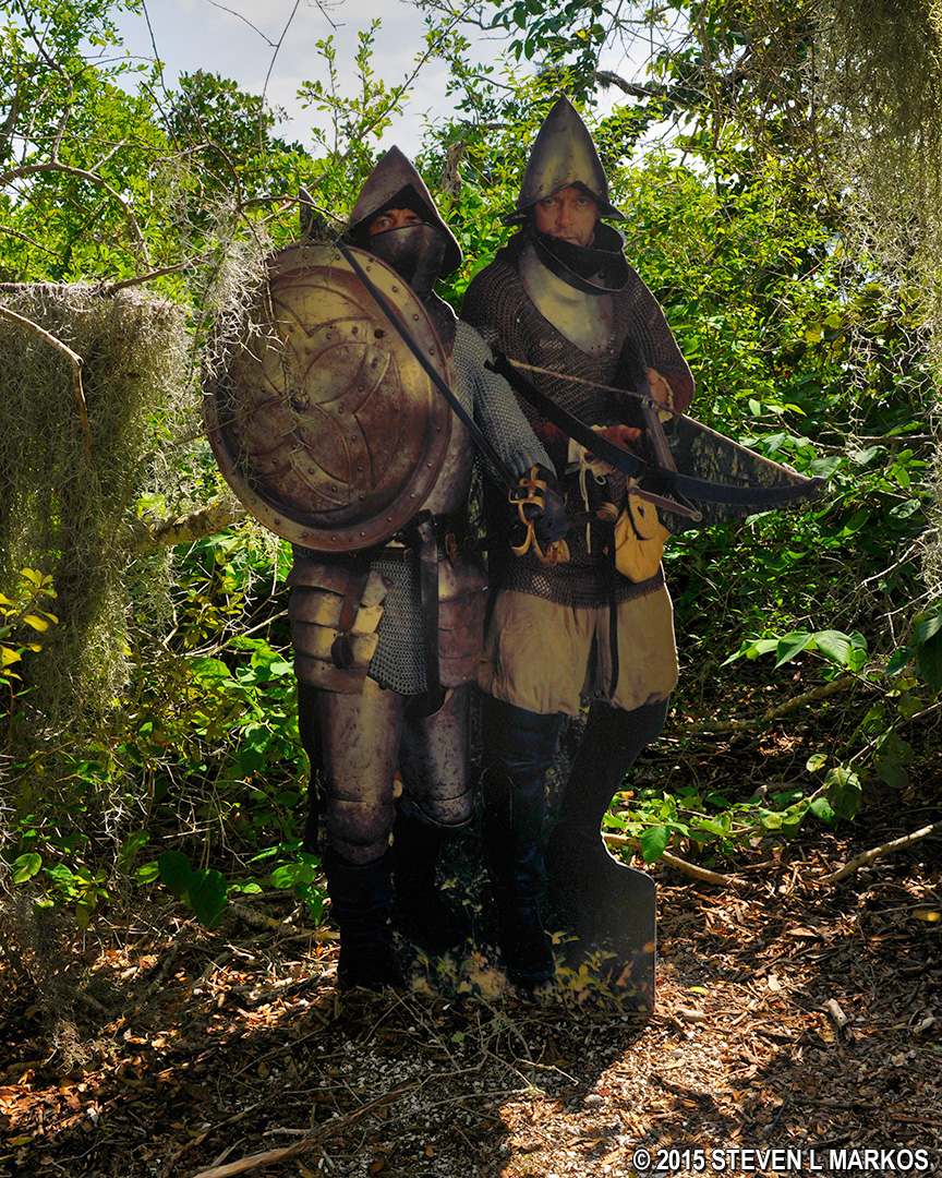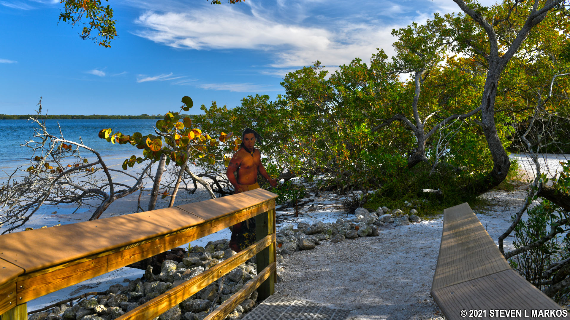 Once you depart, you will be on the gravel trail for about a tenth of a mile, all the while walking through a mangrove forest. Information panels and life-size cutouts of Spanish conquistadors and local Indians can be found along the way.