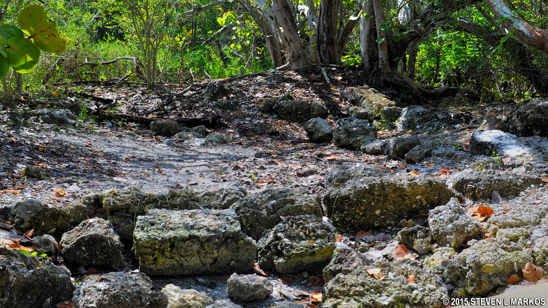 The boardwalk continues through the mangrove forest and after about five minutes comes to the ruins of the Tabby House. This has nothing to do with De Soto, for it was built around 1840 by William Shaw, a man who lived here with his family in a 16′ x 16′ home before moving in 1855 when trouble with the Seminole Indians erupted and made the area unsafe. The house was built with tabby blocks, which is a concrete like construction material made of crushed sea shells, sand, and water. The shells are obvious upon close inspection, while from afar the blocks look similar to ordinary concrete blocks. When Shaw moved, he took the tabby blocks that he could carry, leaving behind the larger and heavier ones. These are on display today. There is an information panel at the site.
