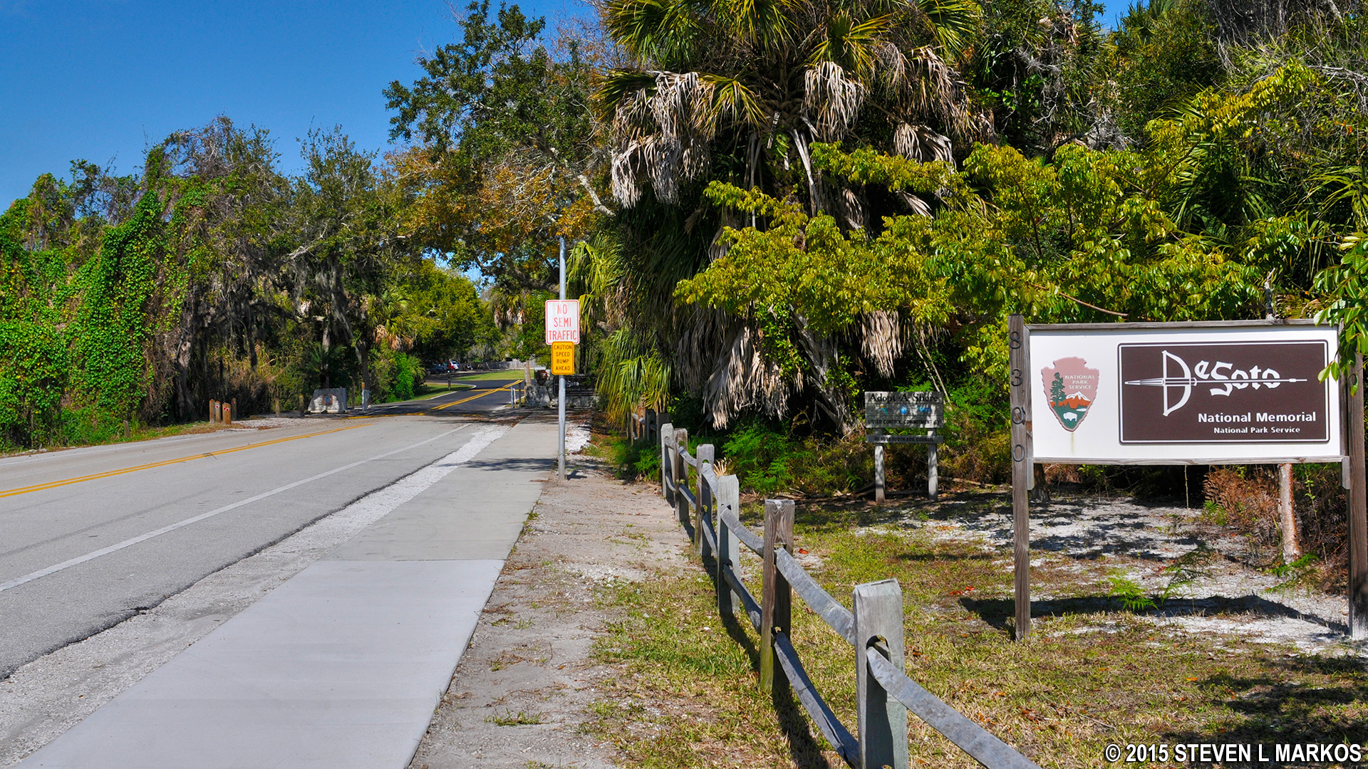 Just before reaching the parking lot is another unmarked intersection with a trail to your right. I kept straight because at the time I had no idea where this trail led. If you continue to the parking lot you must turn right and walk back to De Soto National Memorial via 75th Street. The trail to the right is a short-cut that passes through the forest and comes out on 75th Street about 200 yards up from the parking lot. If I had to do it again, I would take this trail because a walk through nature is more pleasurable than a walk along a street, but in the overall scheme of things it doesn’t make much difference since you eventually come out at the same place.
