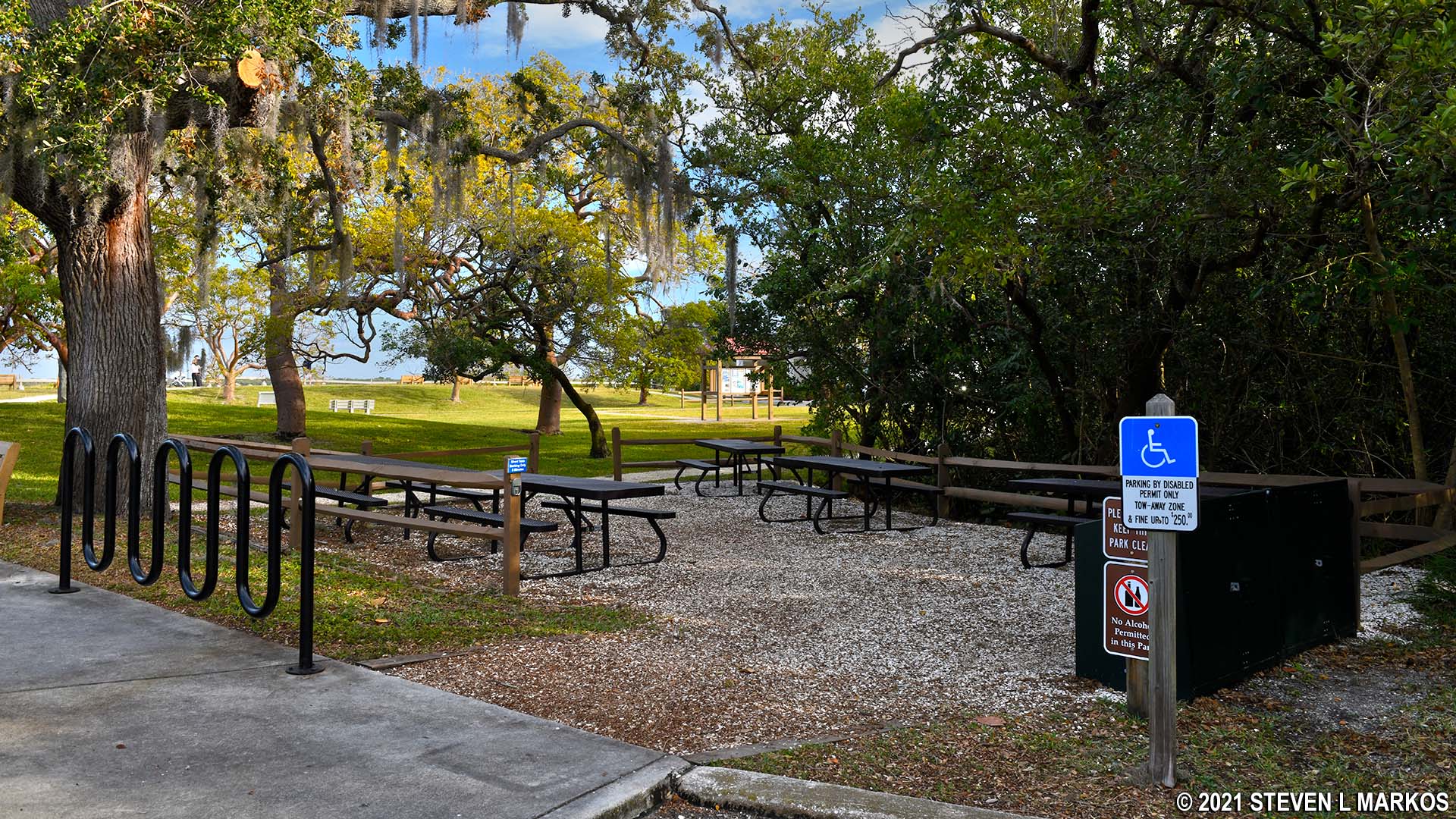 De Soto National Memorial has a small, shaded picnic area with five tables located next to the parking lot. There are no grills here, so this is just an area to have a snack or sandwich. It is not a picnic area where you would hold any type of large gathering.
