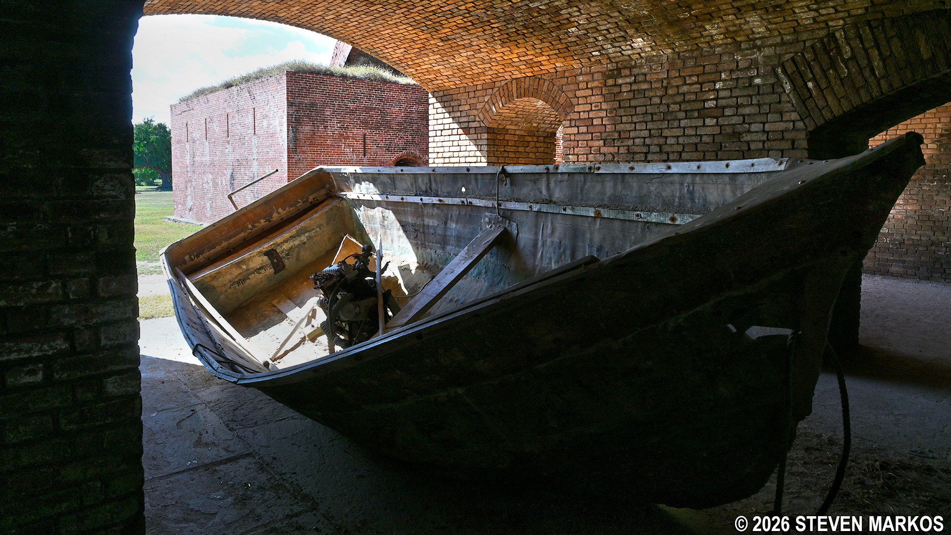 One of the most interesting exhibits at Fort Jefferson is a boat used by Cubans to escape to the United States. Per legislation passed while Bill Clinton was president, any Cuban who could land on American soil got to stay in the country and pursue citizenship (Barack Obama ended the policy in 2017). The keys of Dry Tortugas and Key West are the closest to Cuba, but it is much easier to land at the remote islands of Dry Tortugas verses the heavily populated Key West. The boat on display is from a 2007 landing by 33 Cubans on Loggerhead Key. It is located in one of the lower level casemates.