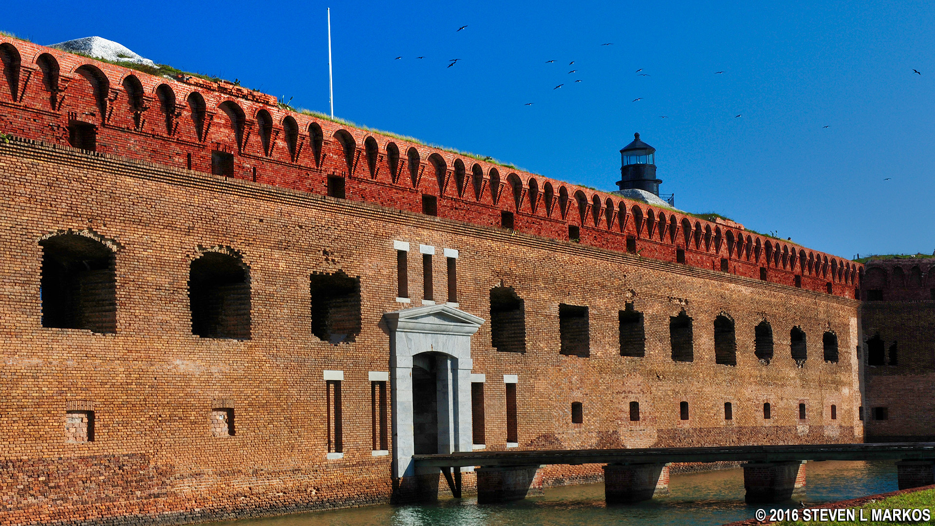 Begin your tour of Fort Jefferson by crossing the moat bridge and entering onto the fort grounds through the sally port, the term for the main entrance of a fort.