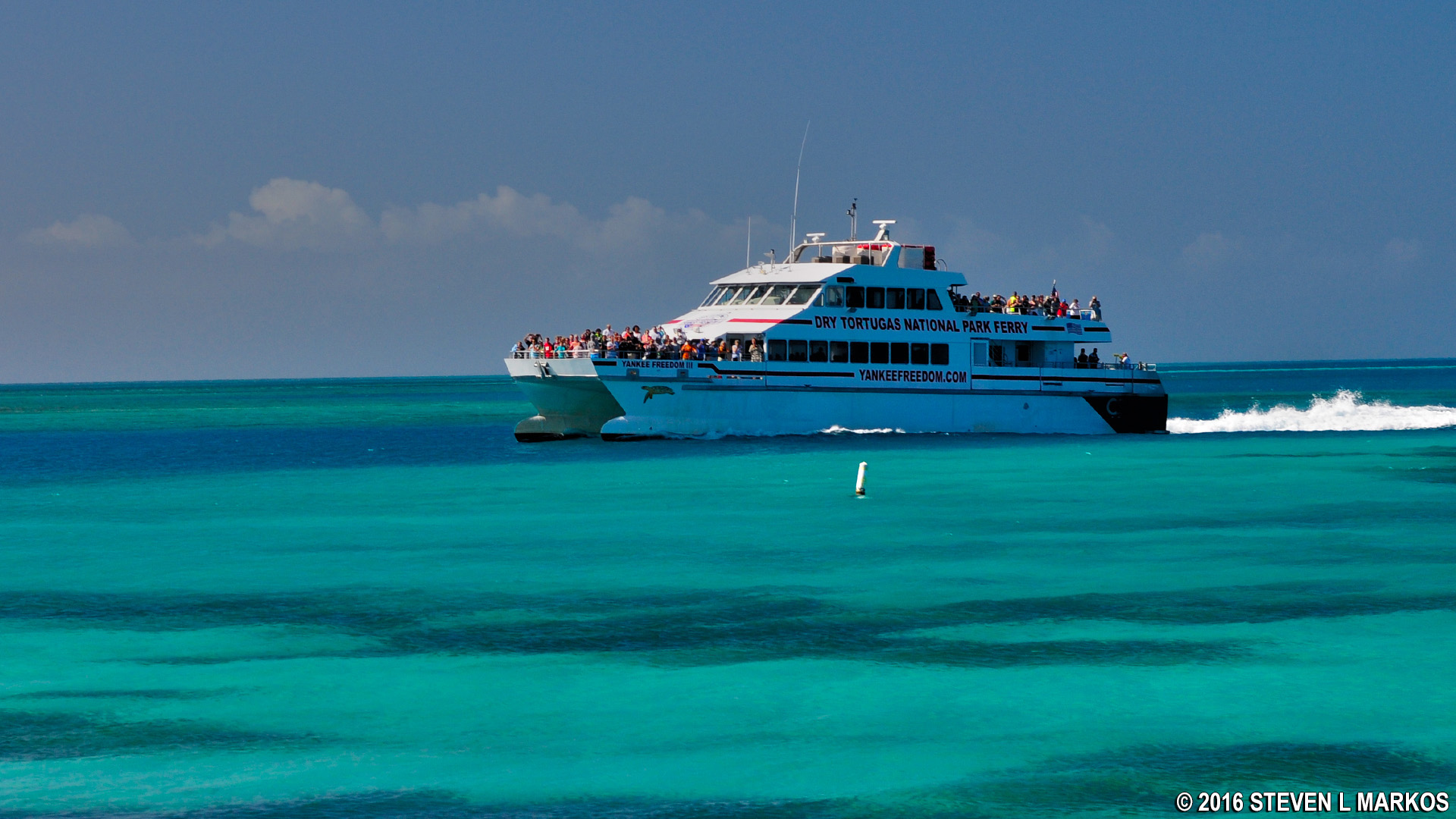 Dry Tortugas National Park is located 70 miles west of Key West, Florida, and is accessible by boat and seaplane only. The huge majority of the 85,000 people who visit each year come on the 150-passenger Yankee Freedom Ferry, and despite the $250 / person cost, this is the most affordable method of travel. The ferry is the only commercial boat that is authorized to carry passengers to and from the park. All other chartered boats provide fishing, diving, or sightseeing tours. For a list of approved concessionaires providing such tours, see the National Park Service’s Dry Tortugas Charters web page. Remember, for any chartered boat or plane to carry paying passengers into the park, the company must have a contract with the National Park Service.