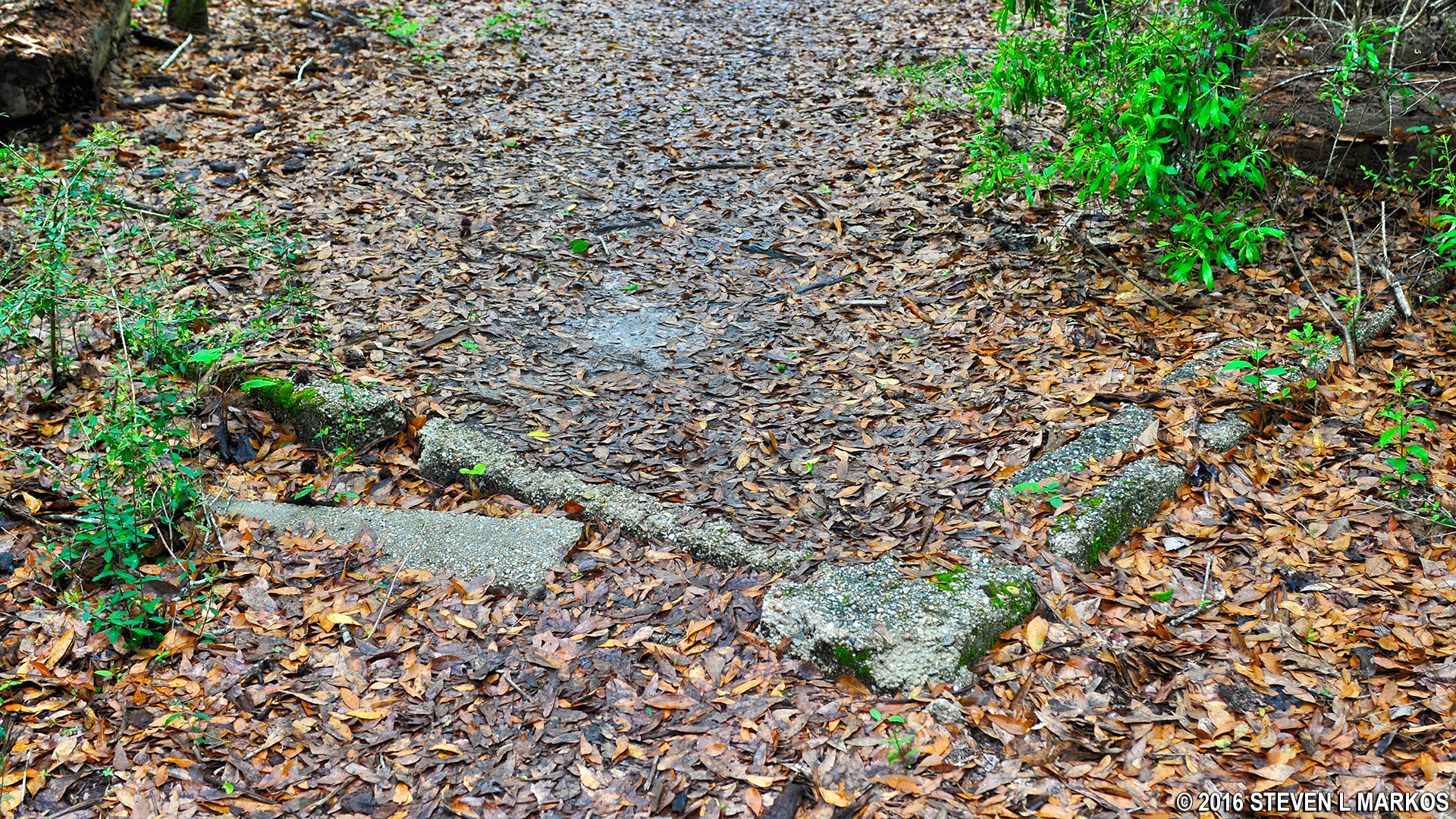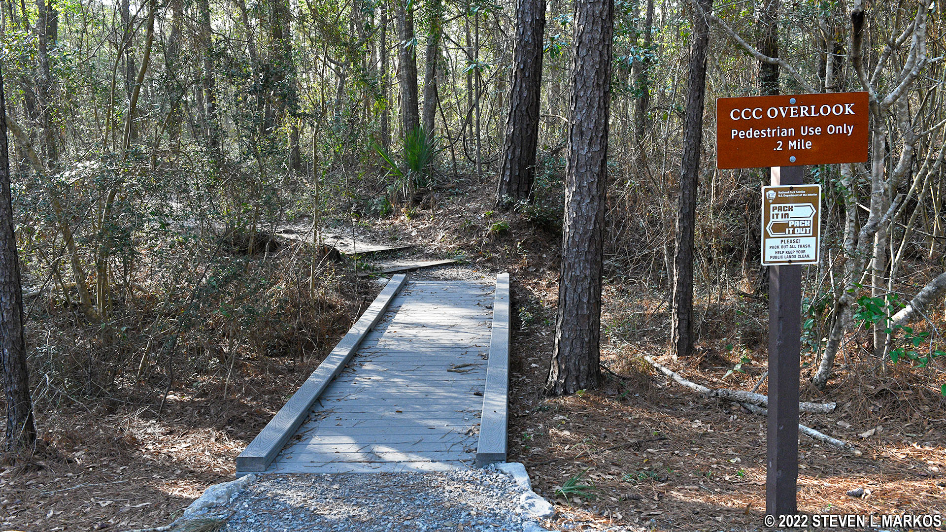CCC stands for Civilian Conservation Corps, which was an organization conceived by the Franklin D. Roosevelt administration to help young, unmarried men get back to work in the wake of the Great Depression (1929-39). Many of the National and State Park trails and campgrounds were built by members of the CCC during this time. In many instances, housing was constructed at the park so the men had a place to stay. What you see at the end of this short trail is the foundation of a dining room / recreation building. The park they helped build was Magnolia State Park, which became part of Gulf Islands National Seashore when it was created in 1971.