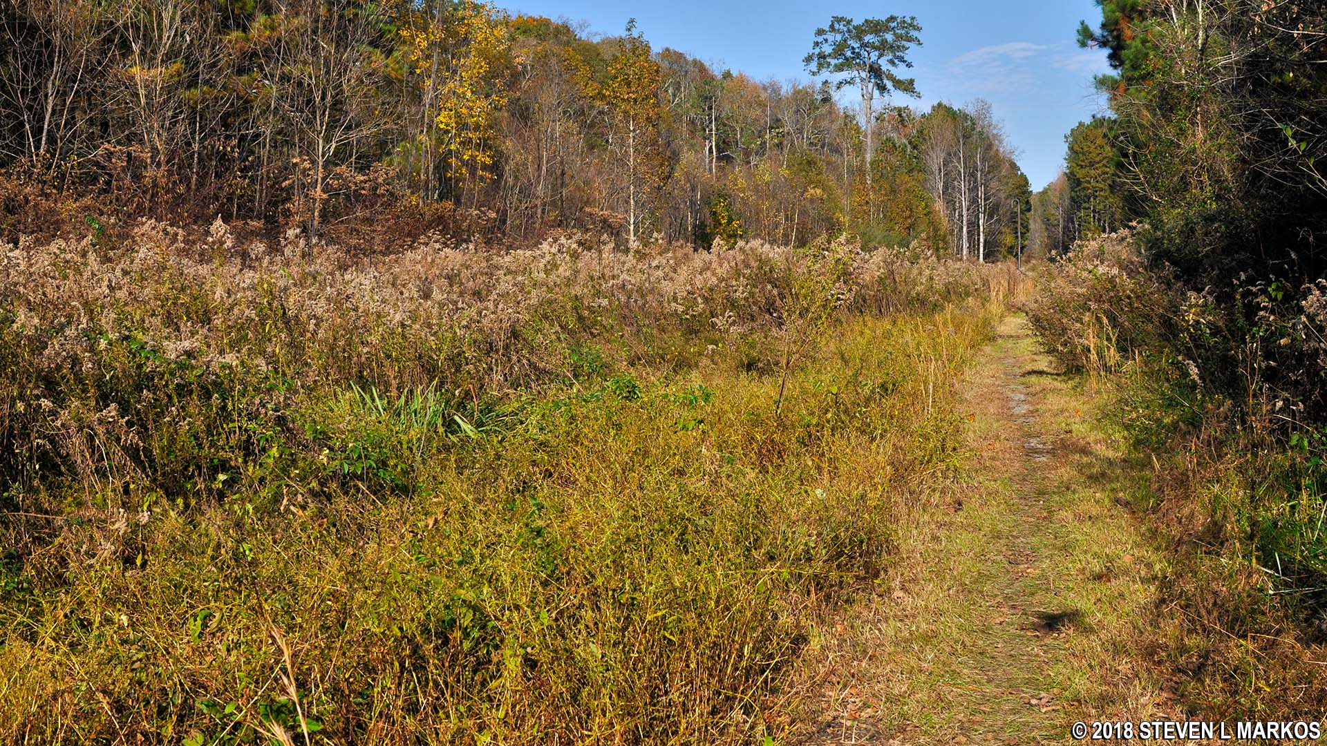 Grassy trail between intersections JN 3 and JN in the Johnson Ferry North unit of Chattahoochee River National Recreation Area