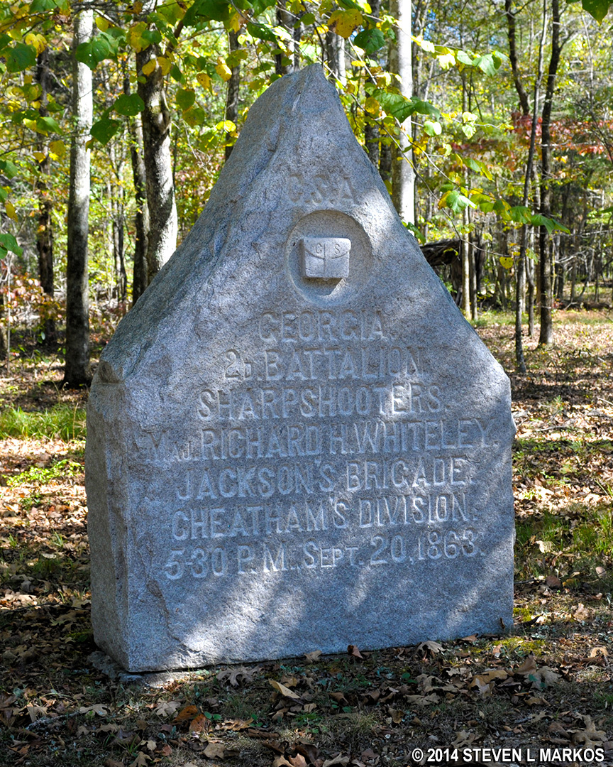 The official General Bragg Trail brochure has you staying on the Red Trail until you come to the Green Trail, which is what I did. In retrospect, however, I suggest turning left on the Yellow Trail, which isn’t too far after crossing LaFayette Road. The reason for this is twofold. First off, you will hike back on the Red Trail, thus covering the same ground twice. Second, when you get to the Green Trail and turn left per the brochure instructions, all you are doing is hiking north back to the Yellow Trail. Taking the Yellow Trail to begin with cuts about a quarter mile from the hike. You will miss a Georgia troop monument along the Green Trail, but you will see plenty of the same monuments on the way back along the Red Trail.