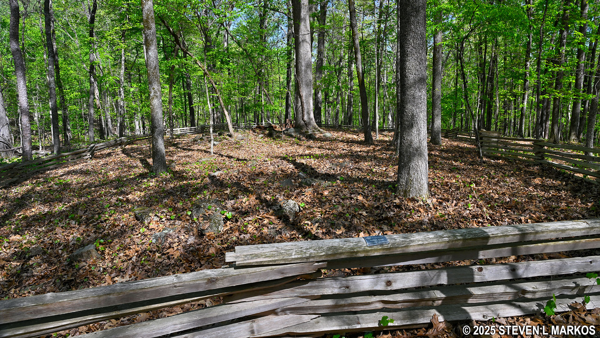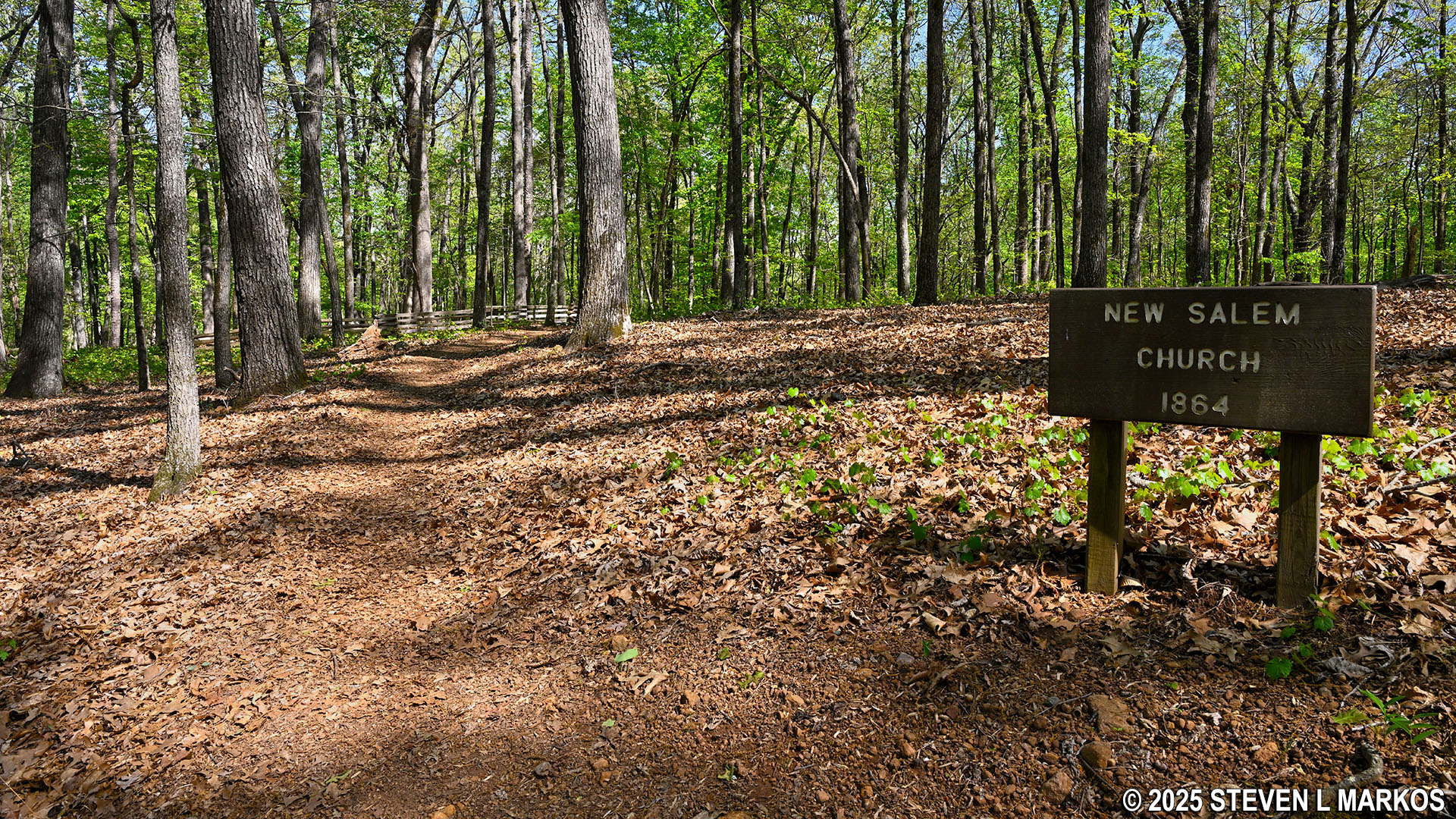 At the top of the hill are some more earthworks, and a little less than a tenth of a mile later is the site of the former New Salem Church. As mentioned, there is no longer a building, and the New Salem community never rebuilt it at this location. A short side trail leads to a rail fence that encircles the church site.
