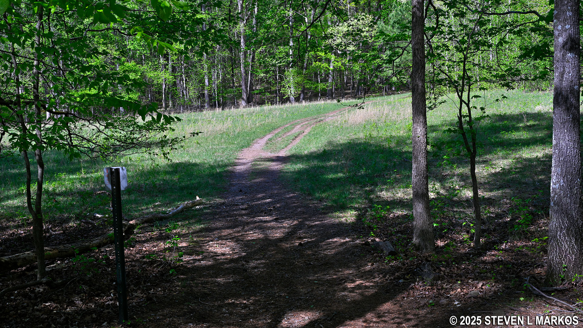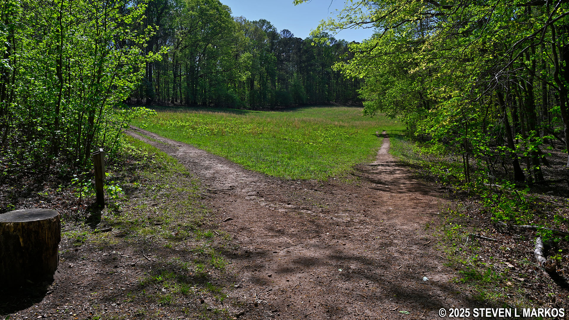 After a very short level section at the top, it’s back down on a hill identical to the one you hiked on the way up. At the bottom is an open field. When you get to the far side, notice that if you were coming the other way that the trail forks. A right cuts over to the Noses Creek Trail. Left is the way to go to stay on the New Salem Church Trail (again, if you are coming the other way).