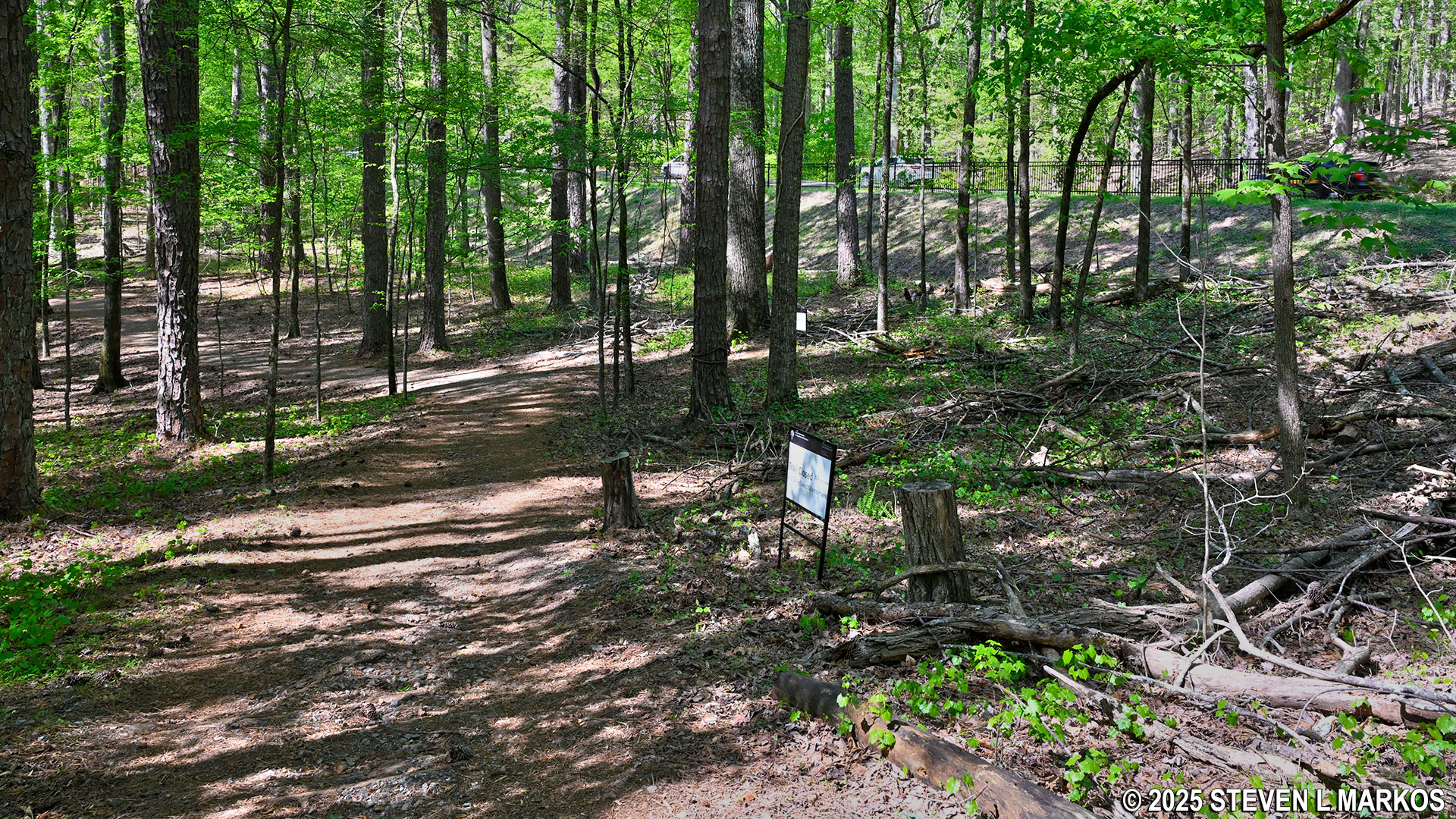 Just beyond the church site is one last downhill stretch of trail. It is 100 yards in length and similar in difficulty to the hike up the hill. At the bottom, the New Salem Church Trail becomes a wide and flat path as it curves to the west and follows along Burnt Hickory Road.