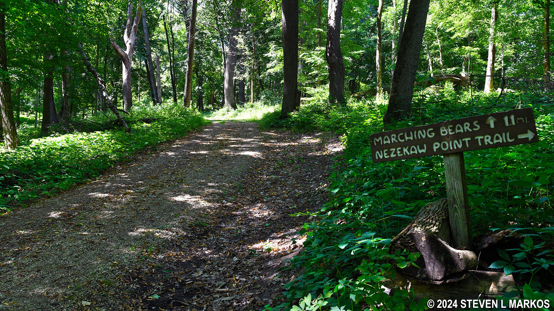 The trail forks at the top of the hill, with a right heading towards the Founders Pound Overlook and Nezekaw Point (see the Hike to Nezekaw Point trail report for details). A left sets you off hiking south towards the Compound Mound and Marching Bear groups, which is where you want to go on this hike. There is a directional sign at the fork.