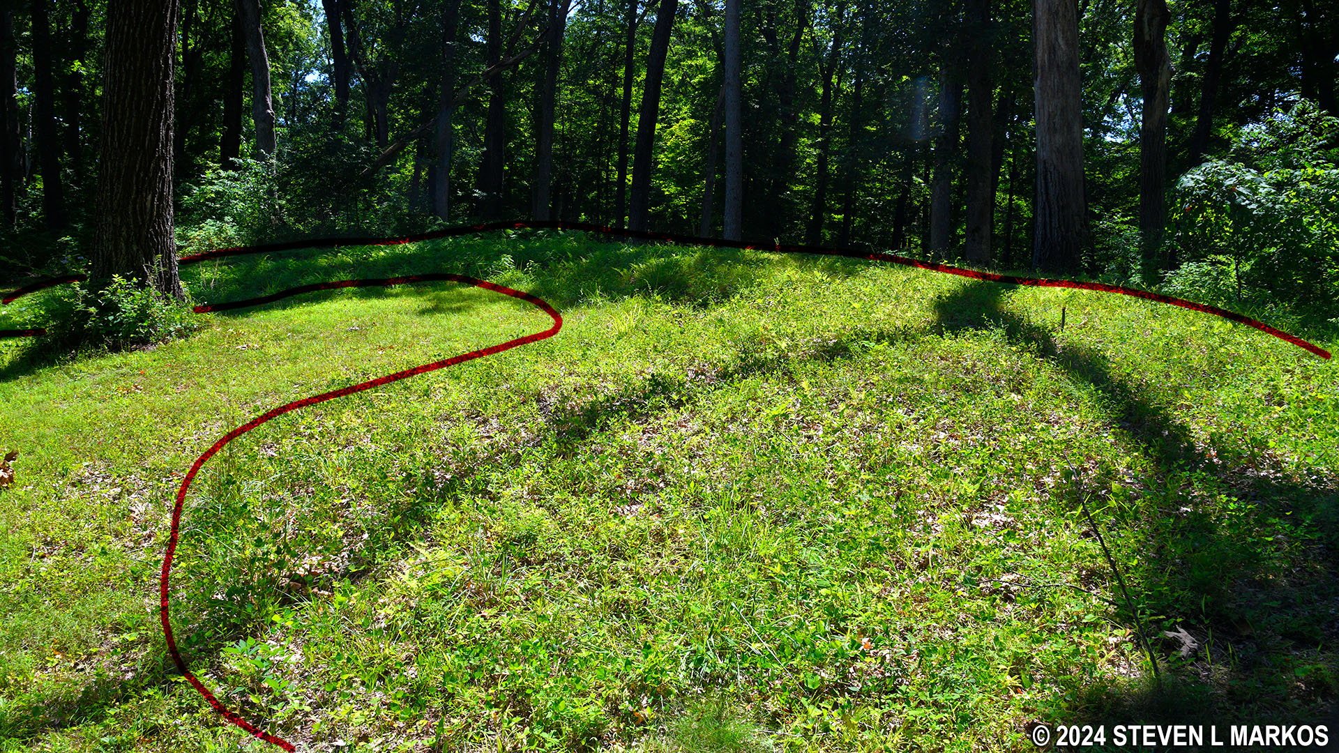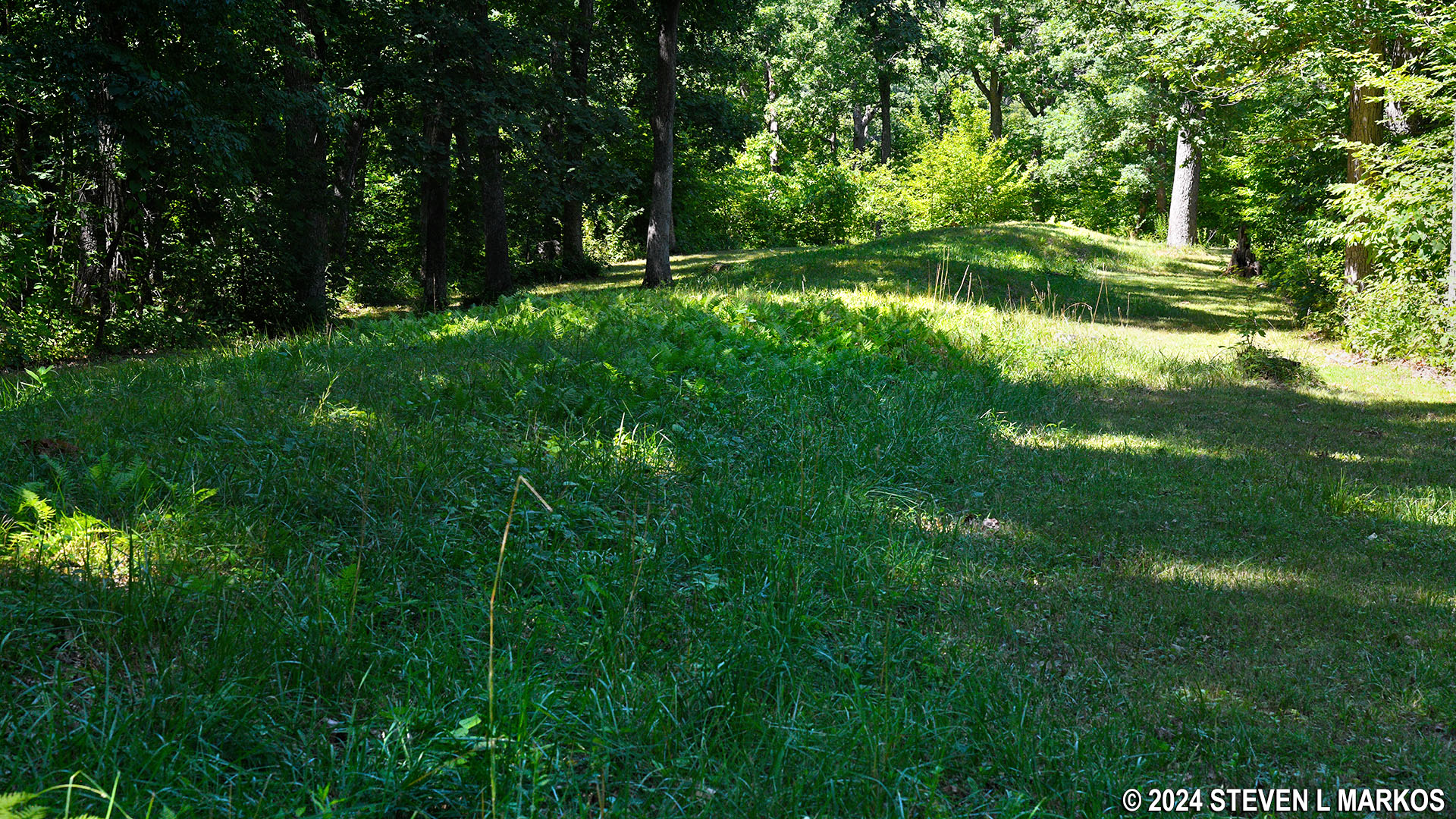 The trail heads up and over a small hill just past the bear. At the bottom is the start of a long stretch of mounds beginning with a bird effigy. As with the bear, it is very difficult to see that this is a bird—it is much larger than the bear mound. I could not get a photo that even came close to showing the shape.