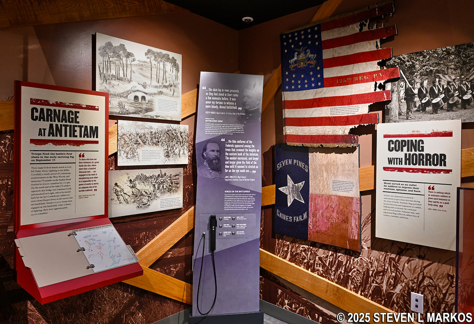 The museum at the Antietam National Battlefield Visitor Center is divided into two rooms, with one covering the battle and the other its aftermath. The Visitor Center only opened in 2023, so the museum has a very modern design. However, it is still mainly comprised of information panels filled with reproductions of archival photographs and newspaper articles, but there are some actual artifacts and a few interactive exhibits as well.