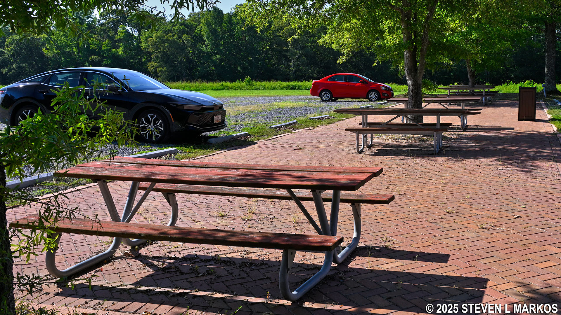 Six picnic tables are located on a brick sidewalk at the Visitor Center parking lot. The tables are under shade trees.