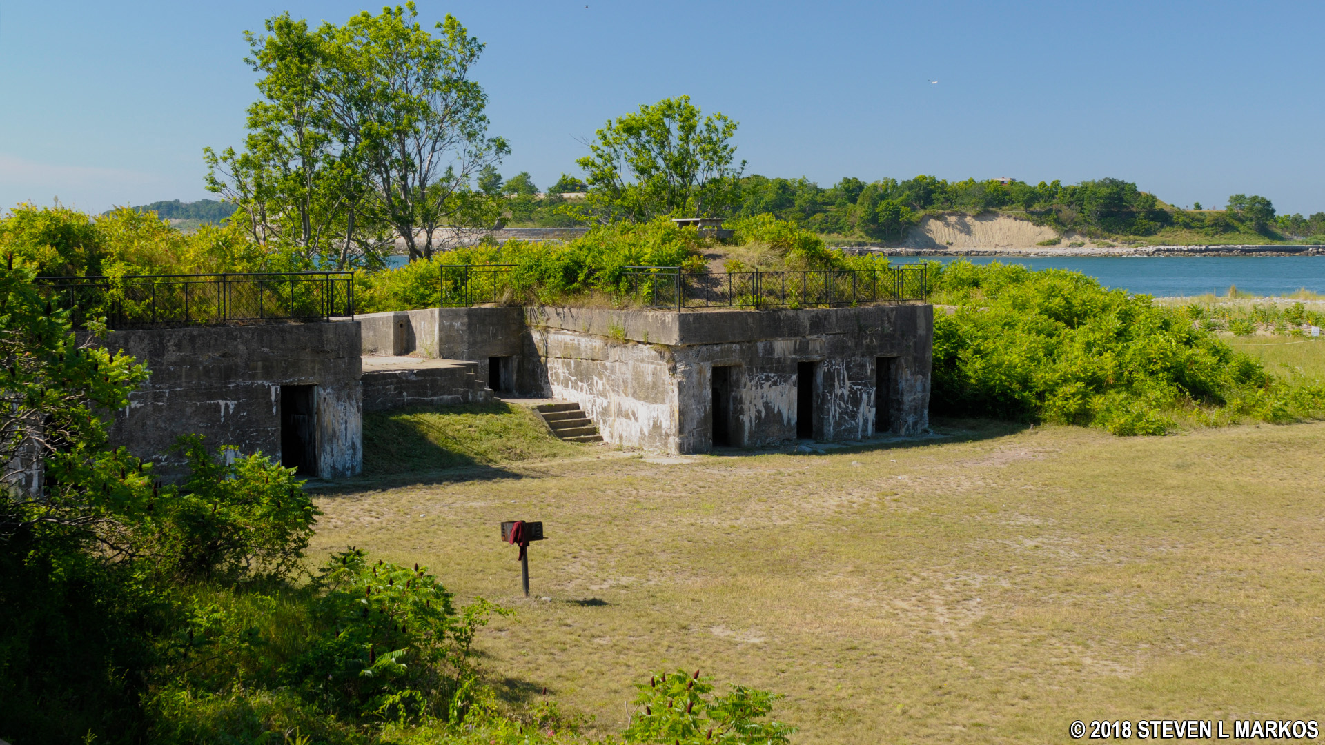 When the road forks, stay to the right and head towards the picnic area. About a tenth of a mile down is a dirt path that branches off to the right and leads to Batteries Burbeck and Morris. You can explore these as well, and if you climb the stairs to the top, you can get a nice view of the harbor.