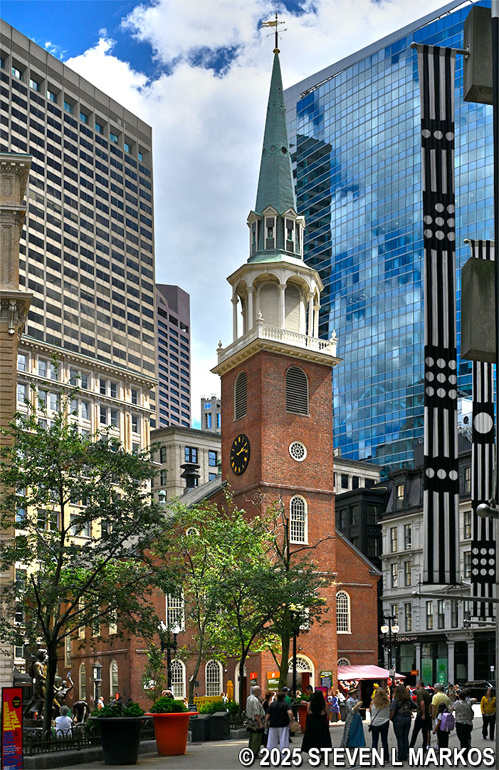 The Third Church, the name of an early Puritan congregation in Boston, first built a wooden meeting house on this site around 1680. When members decided to build a larger space in 1729, they wanted the building to be fashionable so they chose a design similar to the Anglican churches. However, the interior differs in that it has a short center aisle that leads to a pulpit—there is no alter—while the Anglican churches have a long center aisle that leads to an alter.