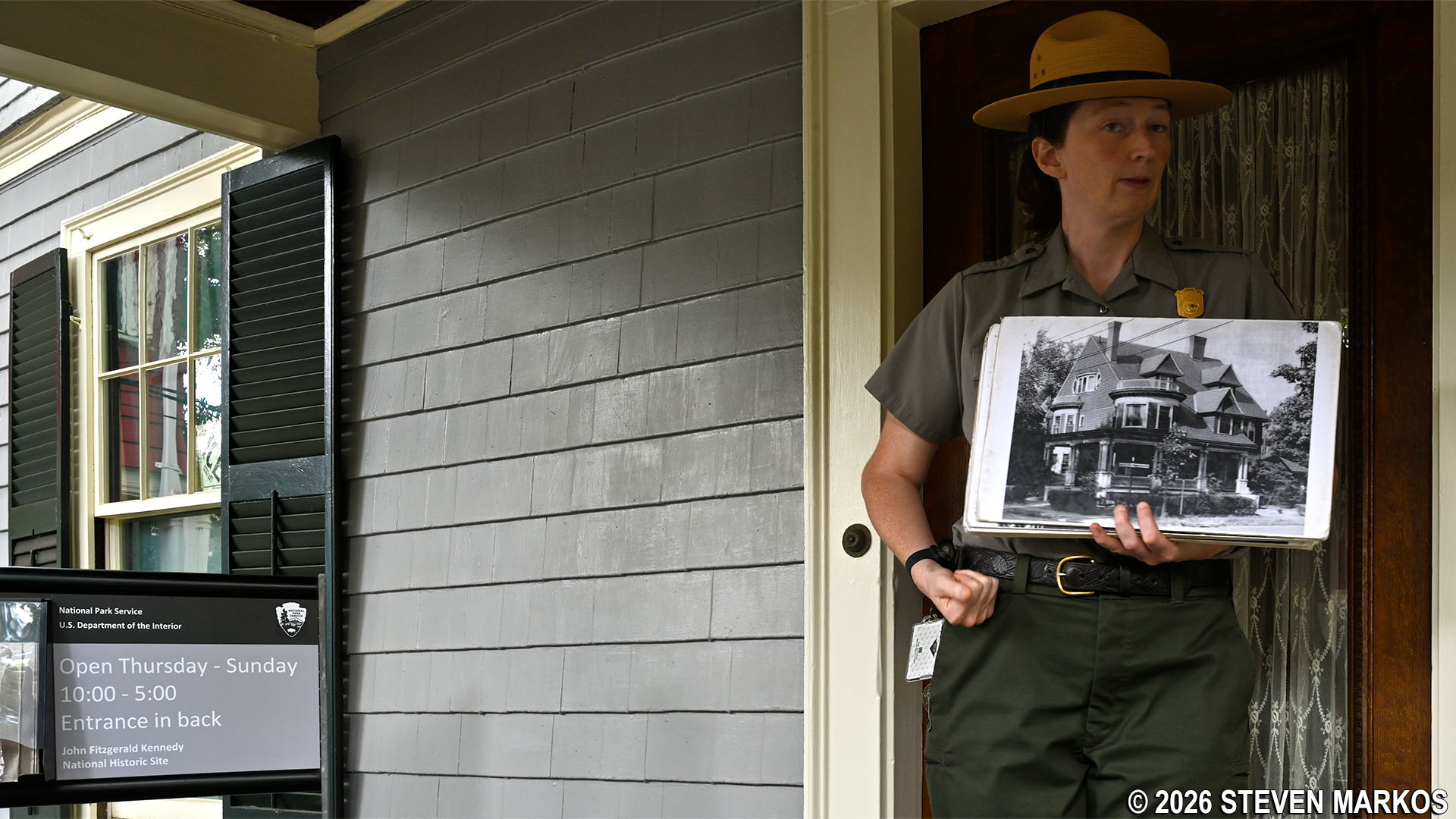 Ranger conducts a tour of the Kennedy House on Beals Street, John Fitzgerald Kennedy National Historic Site