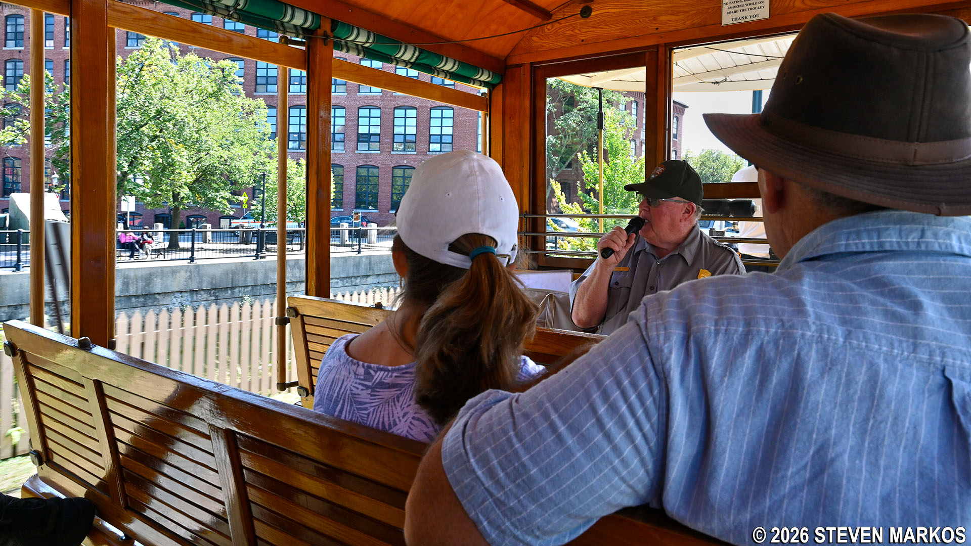 Passengers take the Lowell Trolley to a canal boat tour at Lowell National Historical Park