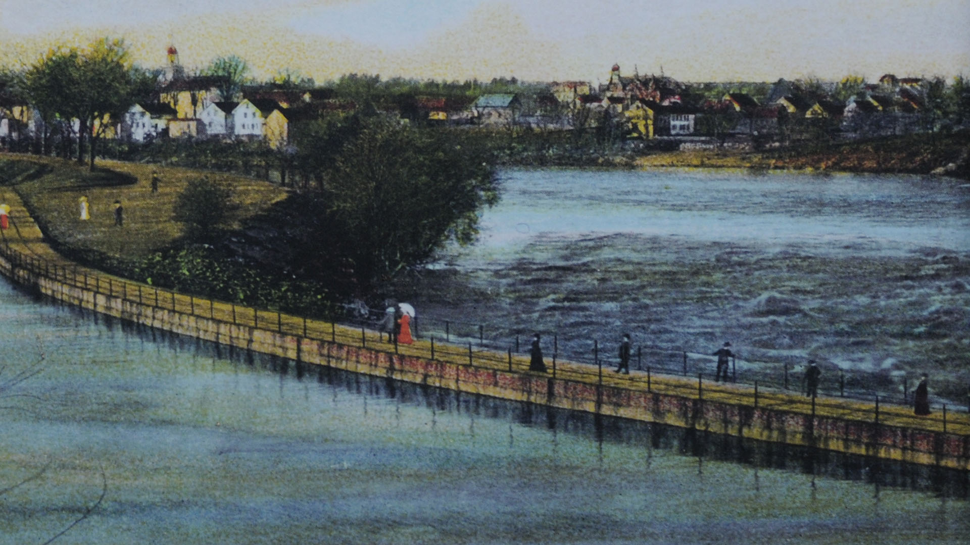 In 2016, the replacing of the flashboard system began under protest of preservationists, the local community, and the National Park Service. Though primitive, the flashboards not only worked, there were so many gaps in the boards that the illusion of a waterfall was created, which everyone loved. The new system used steel plates and inflatable bladders, and very little water escapes between the panels. When air is pumped into the bladders, the wall stays up; let air out and the wall lowers. In a rare instance of a government agency suing another, the U. S. Department of Interior took the Federal Energy Regulatory Commission to court and lost, and then lost again in a subsequent appeal. The project was completed in 2018.