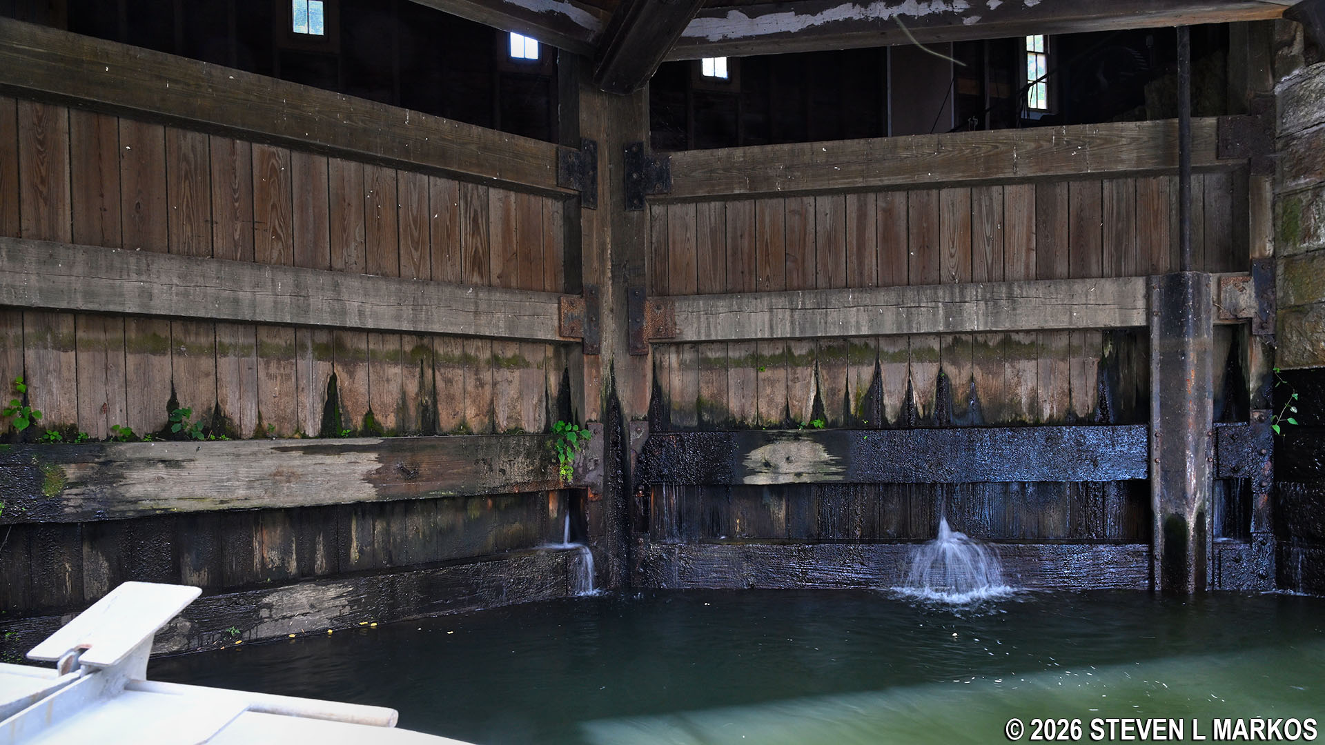Upstream lock gates underneath the Lockhouse at the Guard Locks on the Pawtucket Canal in Lowell, Massachusetts