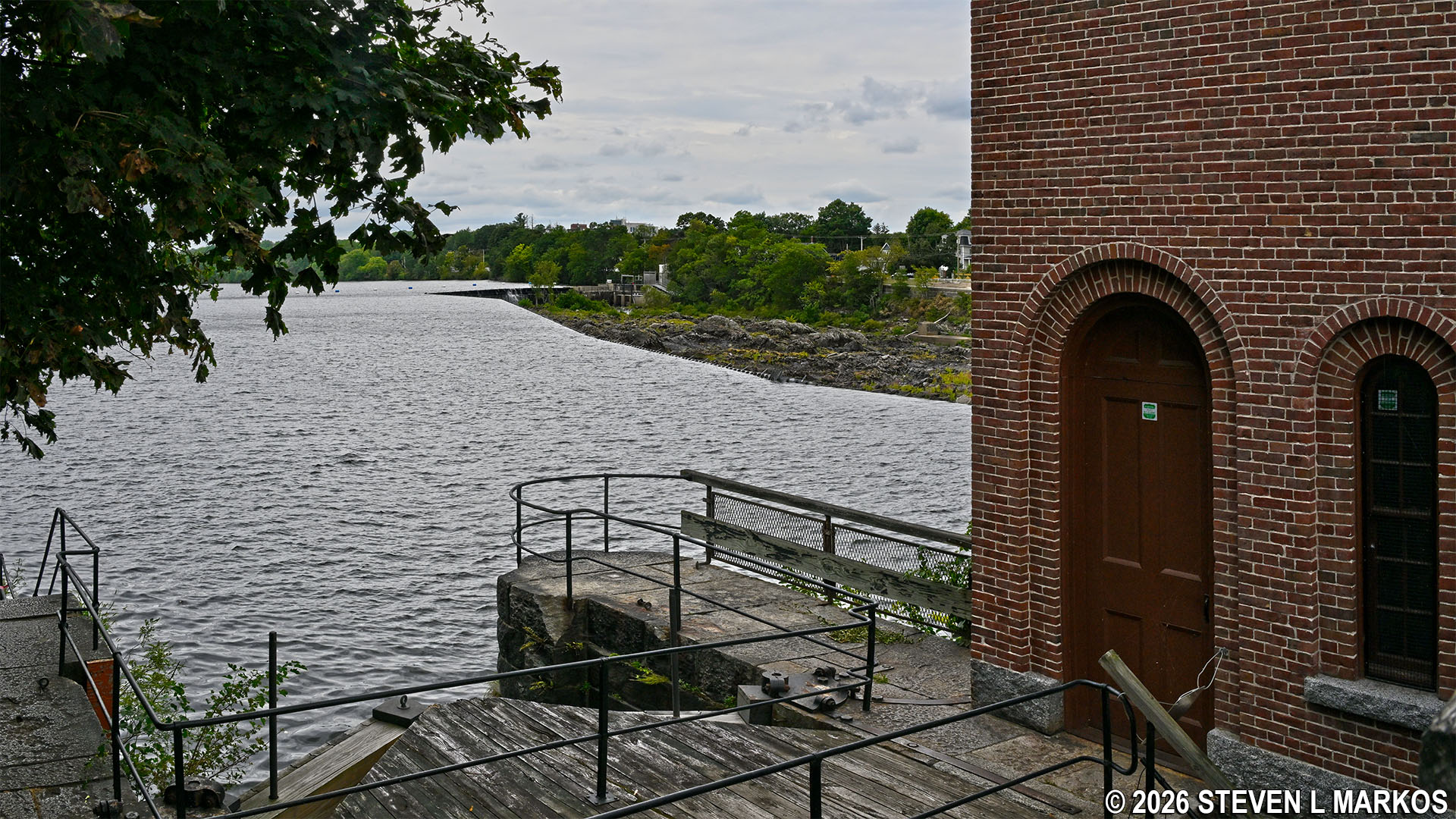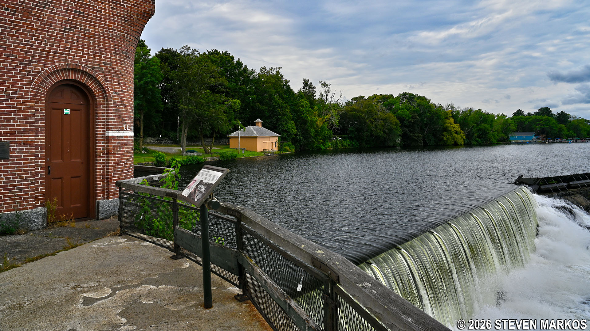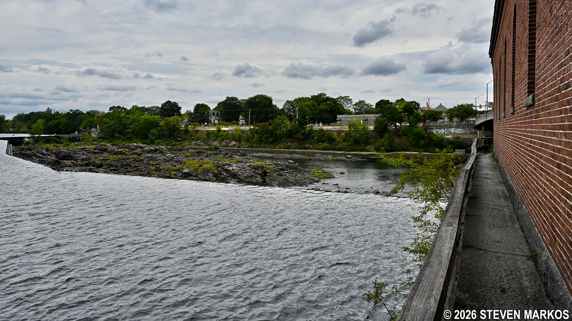 To continue the Riverwalk Ramble and to get the best view of the Pawtucket Dam—which you cannot see at this point—walk directly across the street and pass through a picket fence gate to the left of the gatehouse. You can then walk down the steps and along a walkway that runs the length of the gatehouse for an up-close look at the dam.