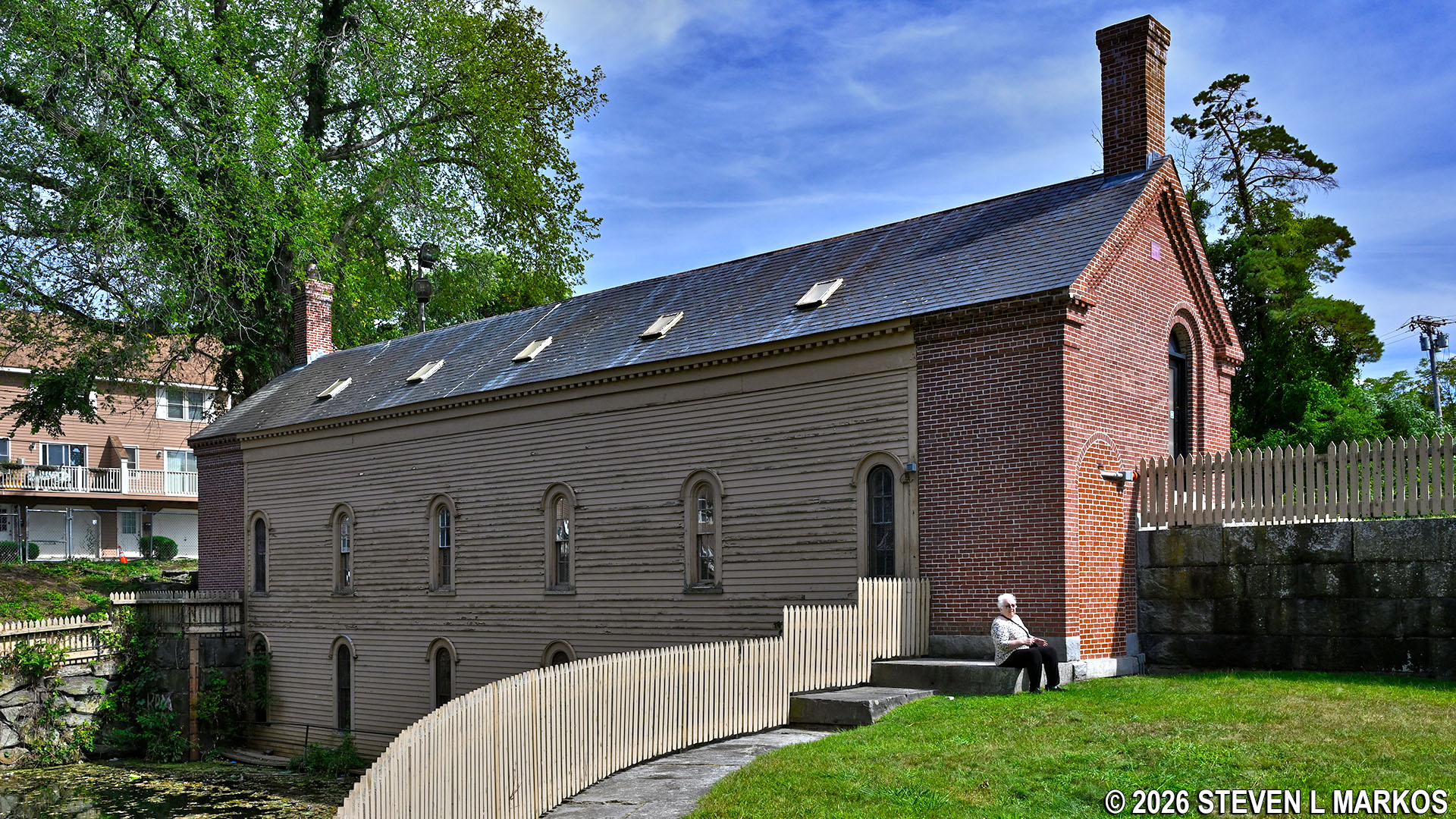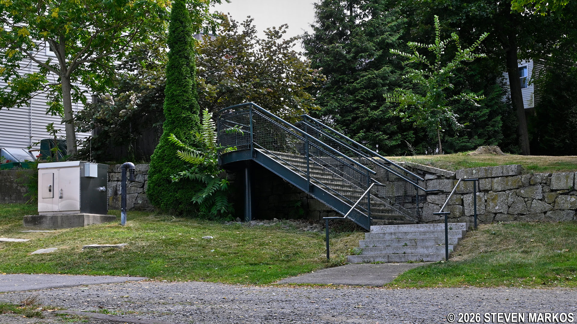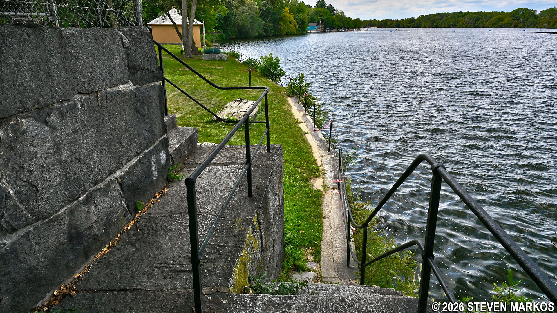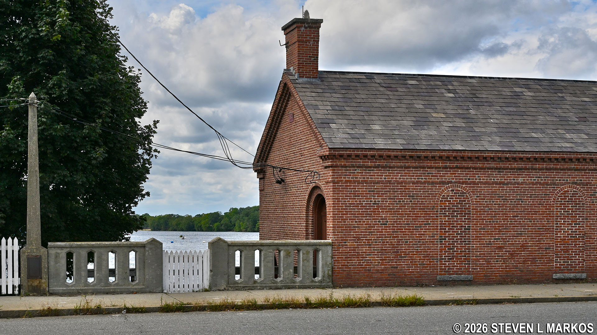 To continue the Riverwalk Ramble and to get the best view of the Pawtucket Dam—which you cannot see at this point—walk directly across the street and pass through a picket fence gate to the left of the gatehouse. You can then walk down the steps and along a walkway that runs the length of the gatehouse for an up-close look at the dam.