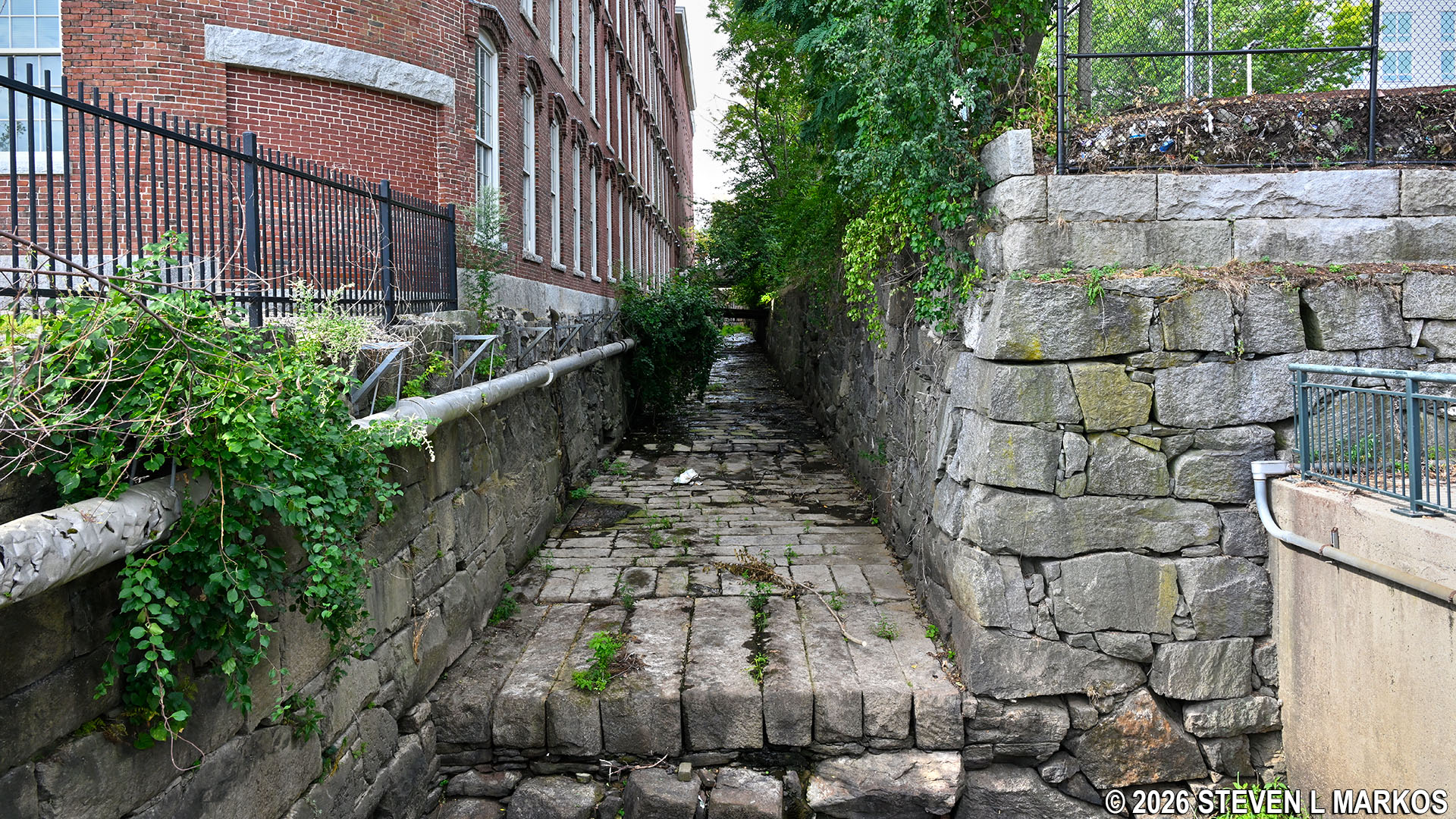 Cement path and original stones slabs make up the surface of the Northern Canal Walkway in Lowell, Massachusetts