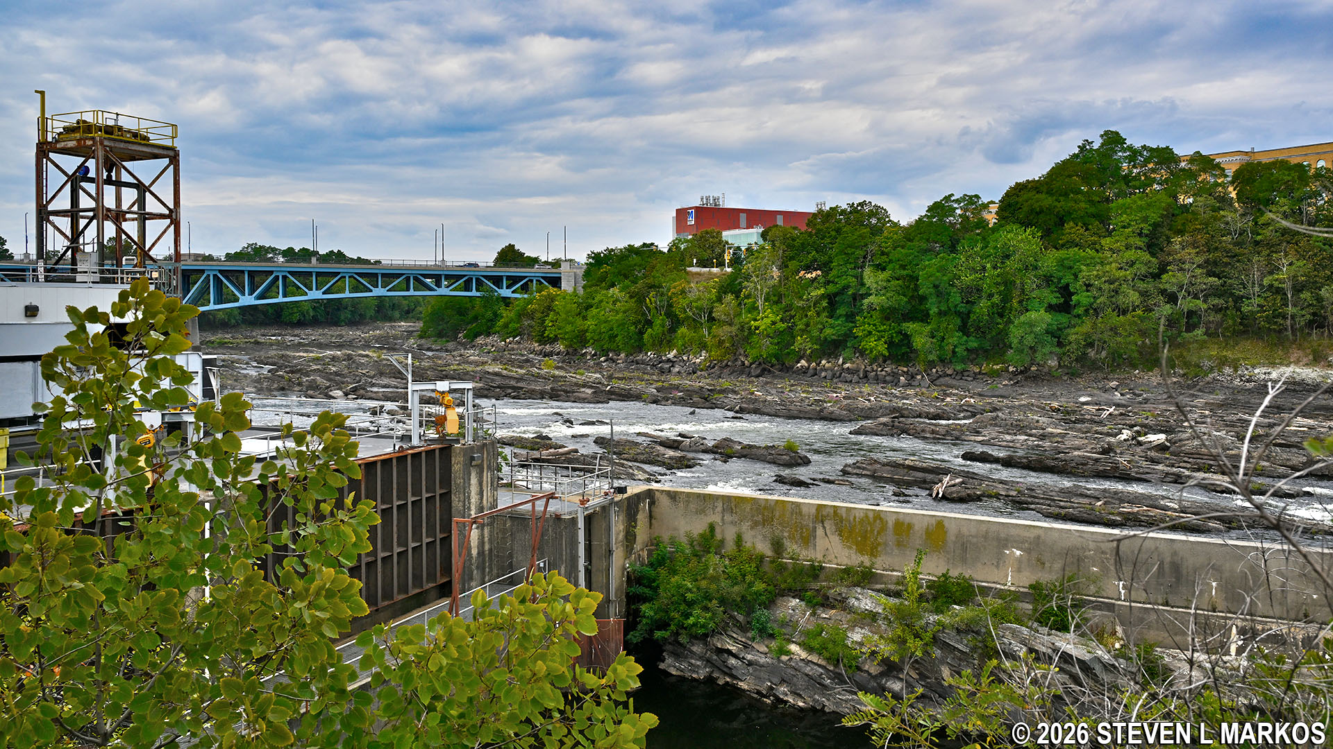 View from the west side of the Pawtucket Gatehouse of the waterfall created by the Pawtucket Dam in Lowell, Massachusetts