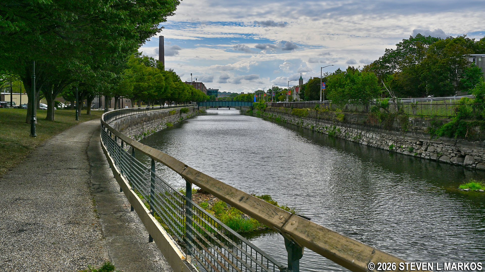 Pedestrian bridge over the Northern Canal as seen from the vehicle bridge on Pawtucket Street in Lowell, Massachusetts