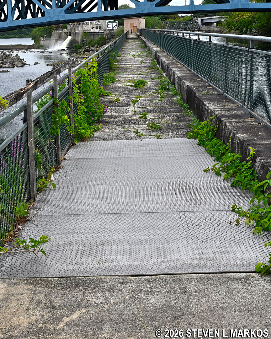 The Northern Canal Walkway eventually ends at the Mammoth Road Bridge (aka O’Donnell Memorial Bridge) and the Pawtucket Dam. Stairs lead up to the road, but the gate at the top is usually locked. If so, just take the handicap access ramp that begins under the stairs. At this point you will have walked 1.75 miles.