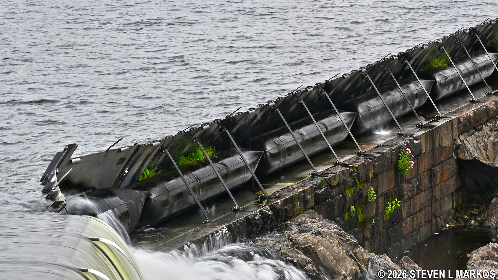 The Pawtucket Dam was built as a 15-foot tall granite wall, and by 1840 it had a wooden flashboard system installed on top that extended its height by two feet. Over the years this increased to five feet. The flashboards were replaced in 2018—a controversial decision—by a pneumatic crest gate system comprised of steel plates and inflatable bladders. This new system is discussed later in this article, but for the sake of posterity, let’s examine the historical flashboard system, which is shown in the photo below.
