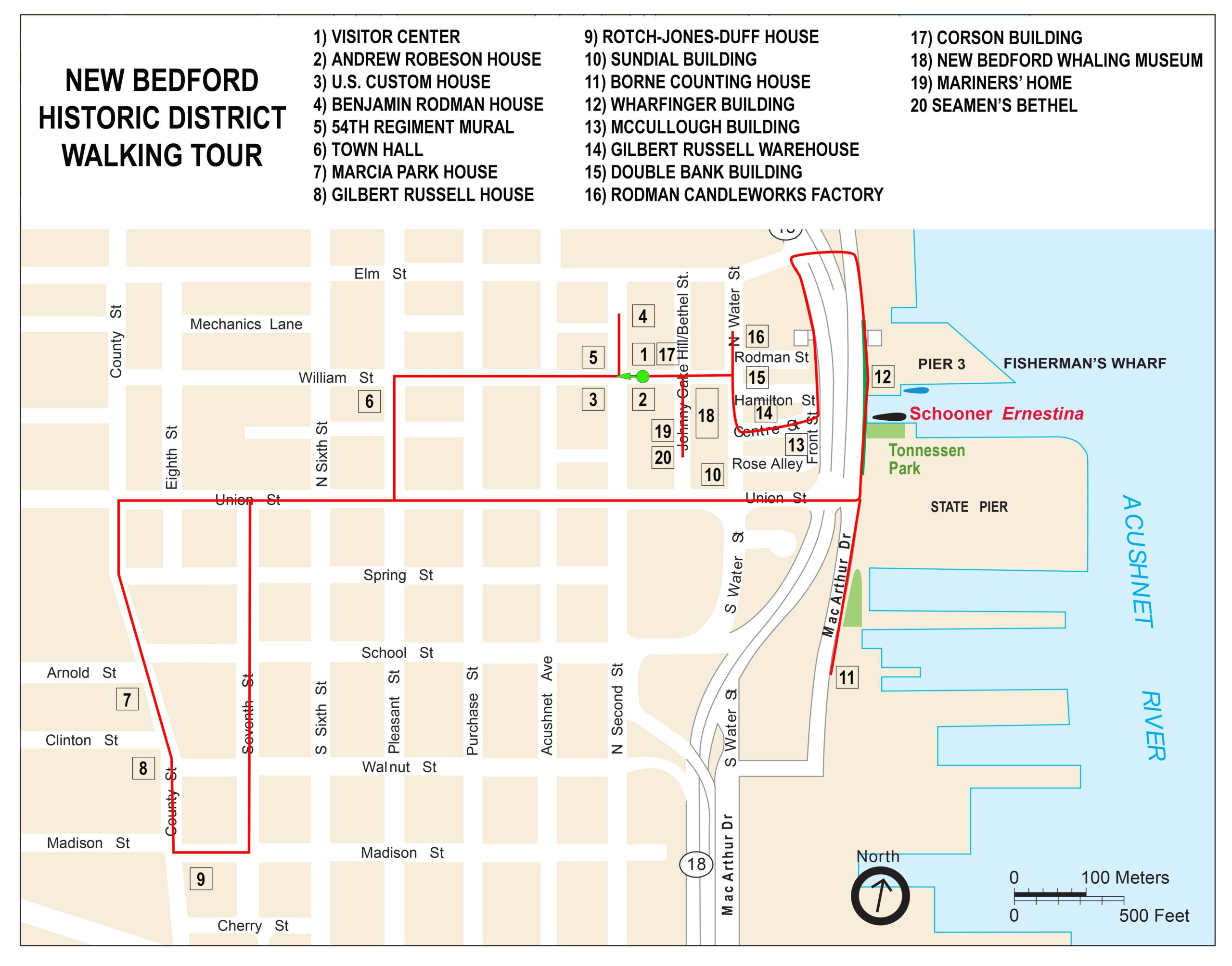 The National Park Service had a walking tour of the New Bedford Historic District that made a side trip to the Rotch-Jones-Duff House. It also had a separate walking tour of the wharf. Brochures for these are no longer available, and nobody at the Visitor Center for New Bedford Whaling National Historical Park had any idea of what I was talking about when I asked for a map, so have combined both tours together—historical area and wharf—and have created my own map for visitors to New Bedford to follow. The route is 2.25 miles, and other than a few hills, it is an easy walk along city streets.
