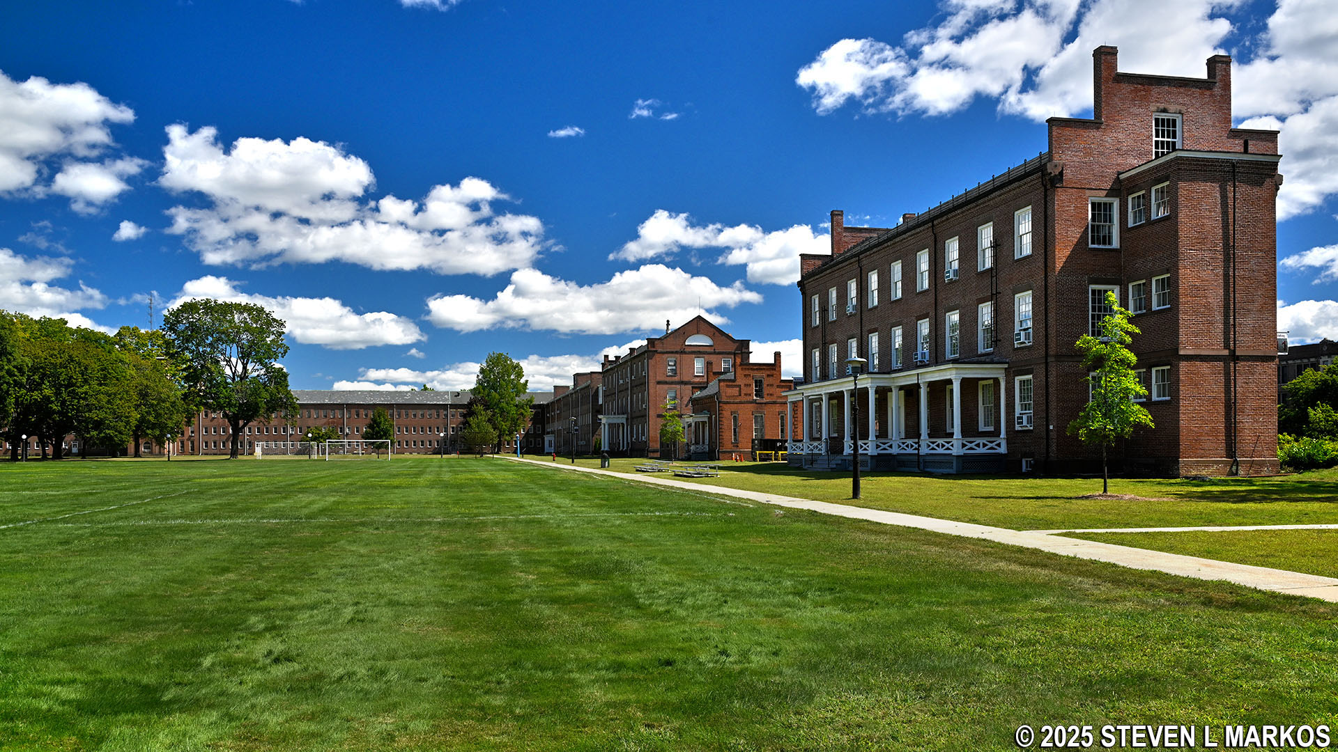 If you wander over to the college campus side of the parking lot, the large field you see is the former Armory Square, a green space around which the armory buildings were constructed. Today it is used by the college for sports and events.