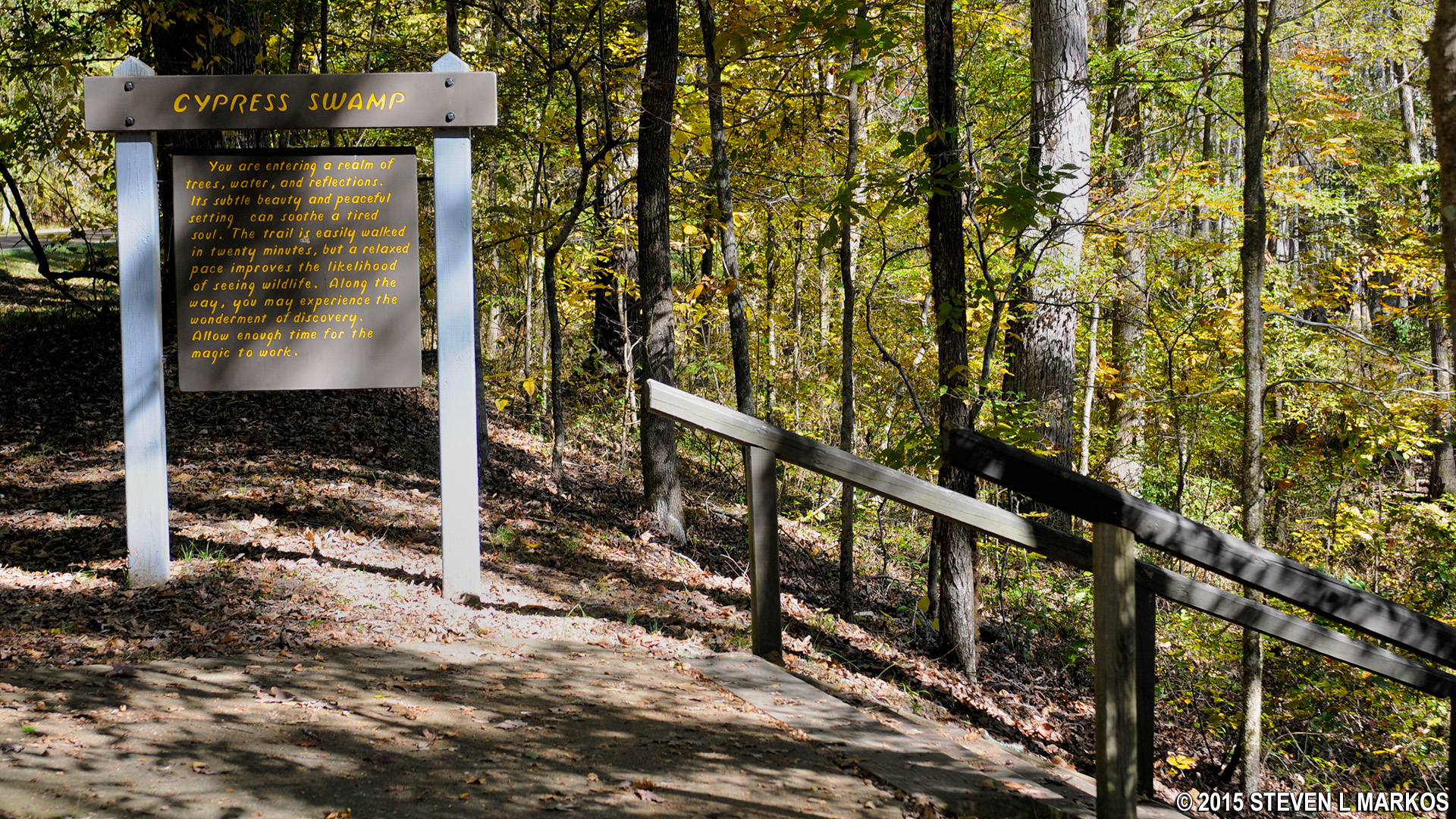 Begin the Cypress Swamp Loop Trail by descending into the swamp via a staircase next to a large information sign. The best views of the swamp are right at the beginning of the hike, particularly when you cross the footbridge at the bottom of the staircase.