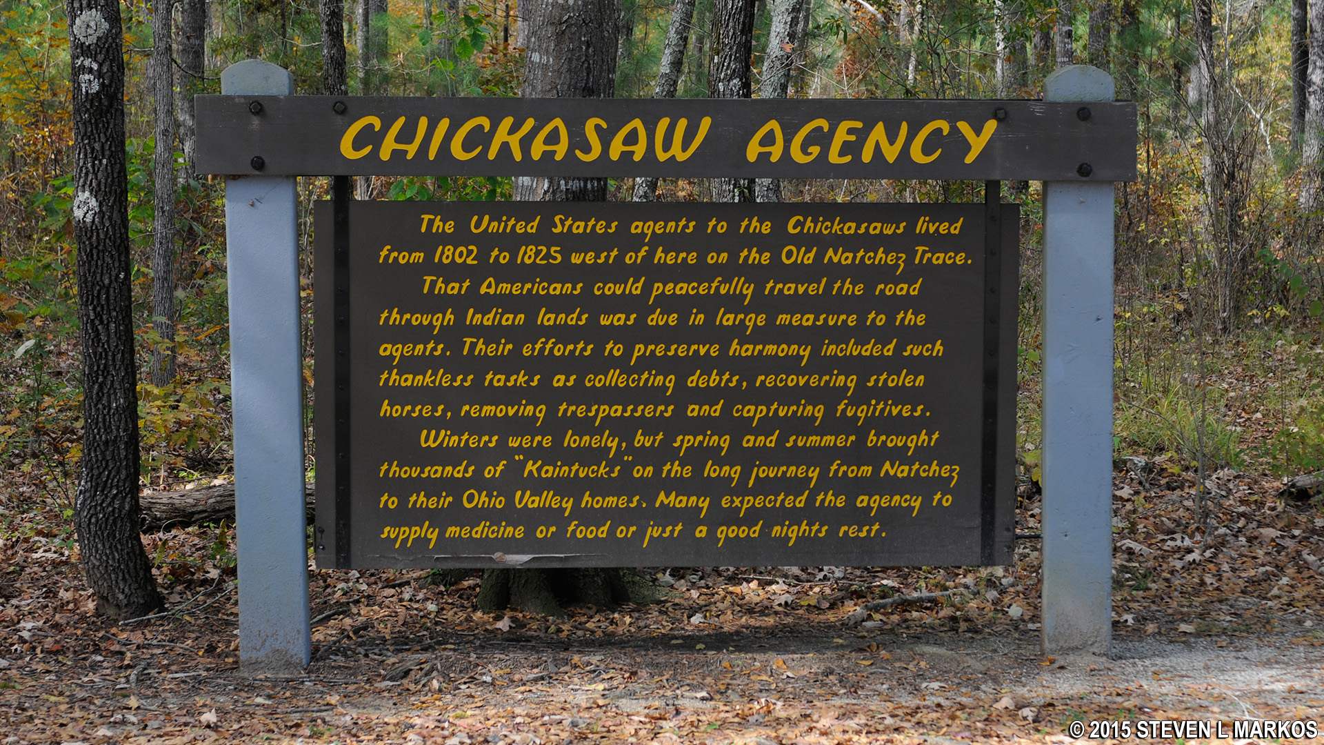 Nothing other than an information panel about the Chickasaw Indian agents can be found at the Chickasaw Agency pullout on the Natchez Trace Parkway. The United States government set up agencies, which are similar to embassies, within the various Indian nation borders, and the American agent acted as a intermediary between the two governments.