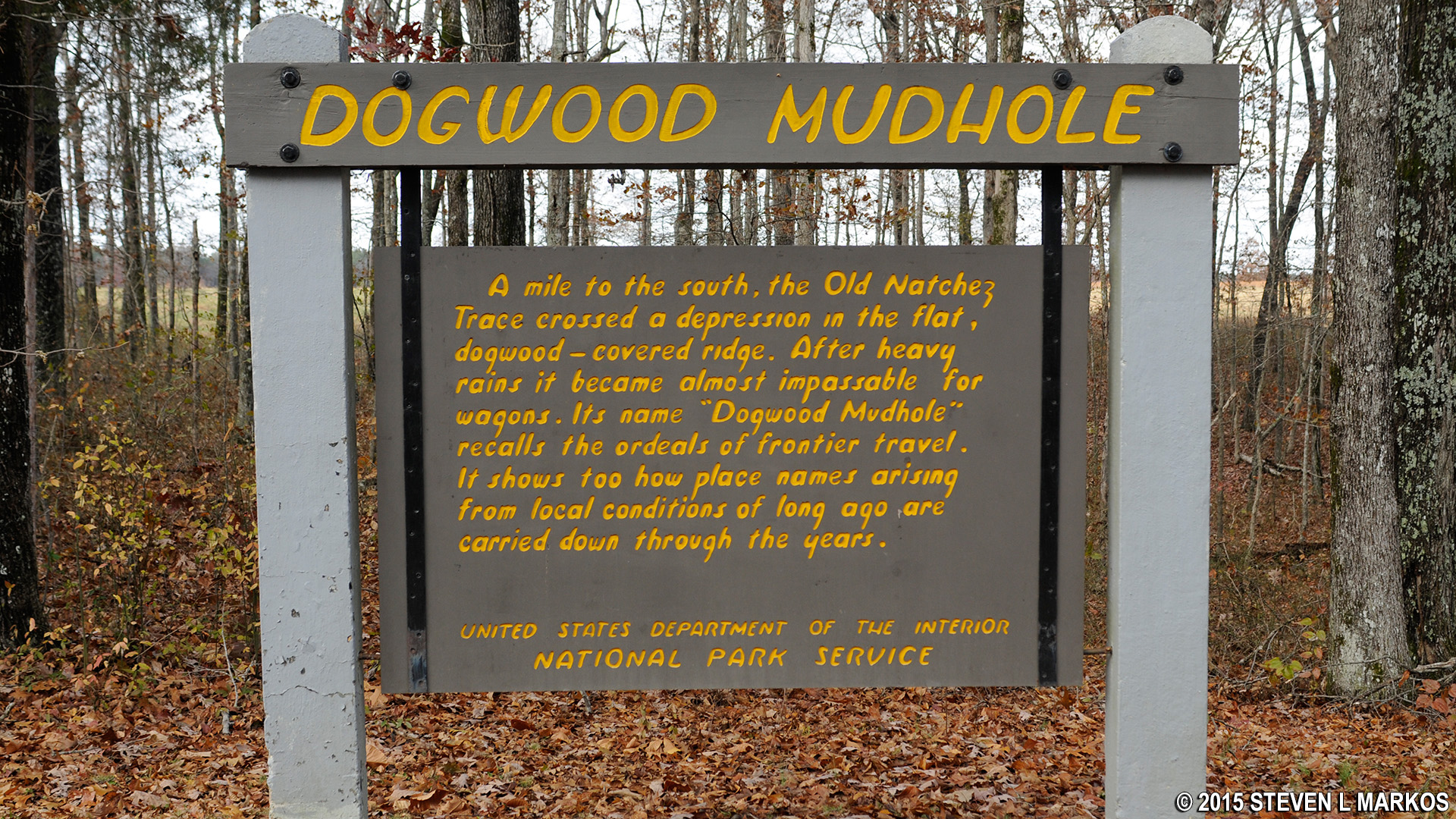 The Dogwood Mudhole stop on the Natchez Trace Parkway is nothing but an information panel that tells about a mudhole that existed a mile south. There is a road that circles the property, but there is nothing along the road, so I fail to see its purpose.