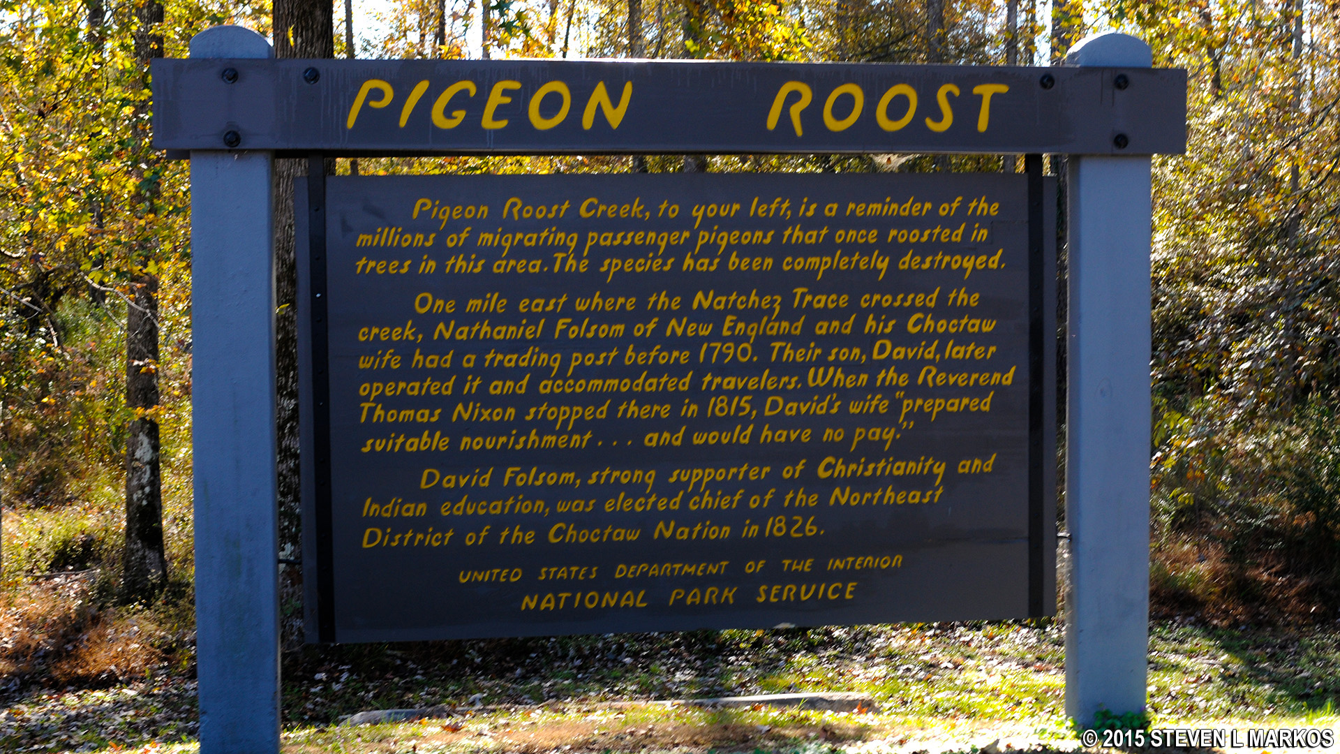 The Pigeon Roost pullout along the Natchez Trace Parkway offers nothing but an information panel on the now extinct passenger pigeon and Nathaniel Folsom, who once ran a trading post in the area.