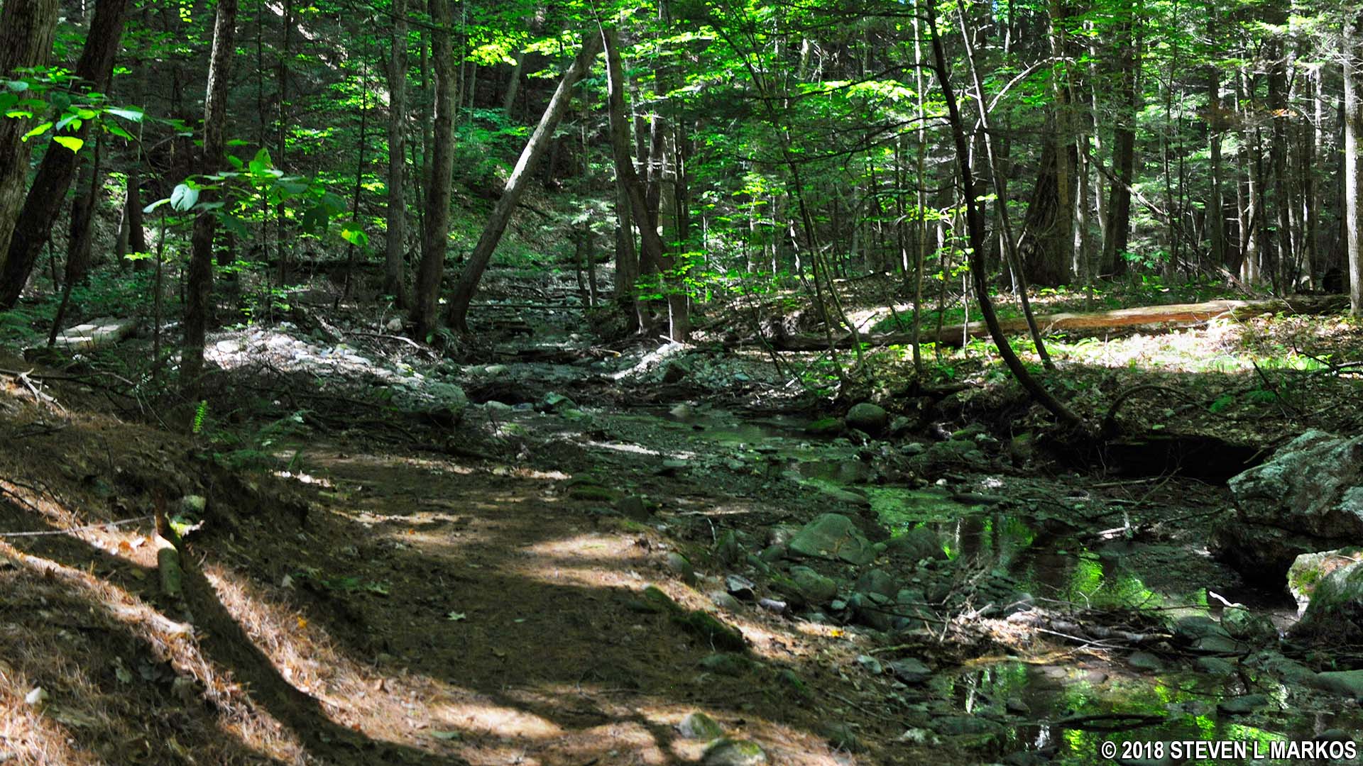 Once at the bottom, the terrain levels out and the trail follows right along the brook. The forest floor has very little clutter, so it is easy to get to the water if you desire. It is a damp area where I would expect to encounter mosquitoes, but I didn’t run into any at all during my early September visit.