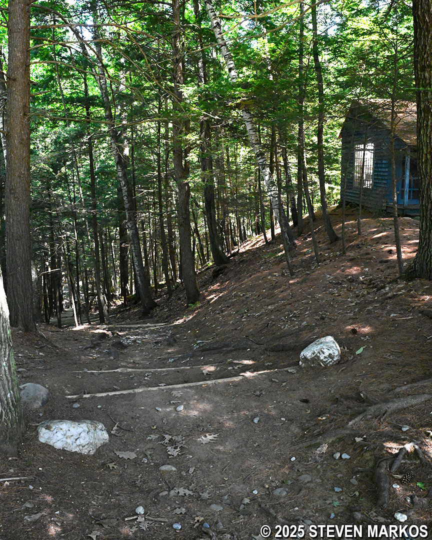 If you wish to hike the Blow-Me-Down Trail, just follow the mowed grass path to the right along the tree line from The Temple. Otherwise, walk back towards Aspet and the Little Studio, which are off to your left.