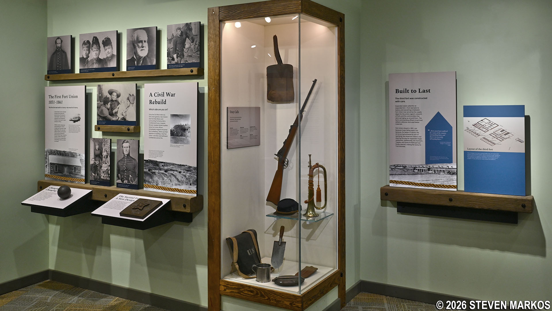 After the Civil War broke out in 1861, Union military commanders decided to fortify western-territory forts in preparation for possible Confederate attacks. A second Fort Union with earthen fortifications was built, and the first was abandoned. However, by 1863 it was clear that there was no longer a Confederate threat in the West, so construction on a significantly larger third Fort Union commenced. This time the fort was to serve as a major supply depot for the ever-expanding region. A section in the exhibit area highlights each construction phase. There is also a display case of items used by soldiers of the time.