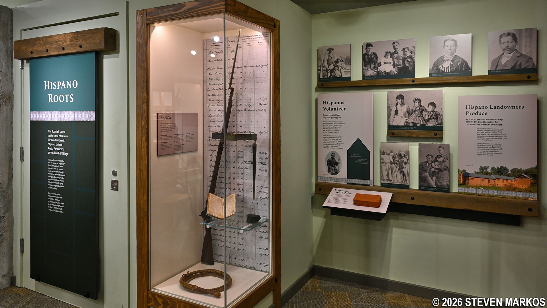 Before American settlers moved into the region, many local residents were descendants of the early Spanish who had arrived after New Spain was established in the 1500s. Known as Hispanos, they lived on and farmed the land in the Mora River Valley decades before Fort Union was built. A group of exhibits focuses on the role the Hispanos had at the fort, from volunteering for military service in the Union army during the Civil War to working on the farms used to supply Fort Union with food. A Spanish language bible carried by one of the Hispano soldiers and an enlarged facsimile of a roster with names of some of the volunteers are part of the exhibits.