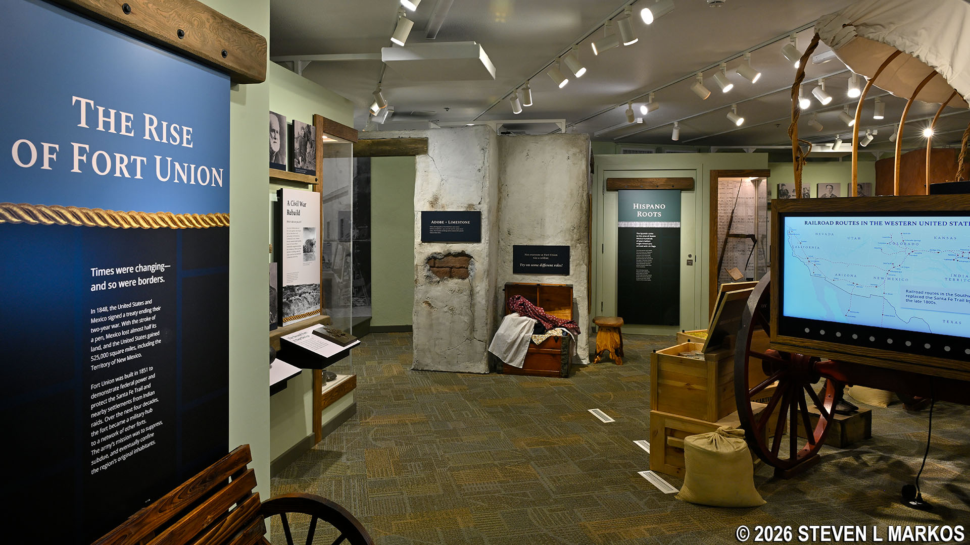 The exhibit area at the Fort Union National Monument Visitor Center is comprised of information panels and artifacts that cover the history of Fort Union and what it was like to live there in the mid- to late 1800s. As the military’s needs changed, three different forts were built at Fort Union. The first one was constructed in 1851 to protect local settlements and travelers on the Santa Fe Trail from Native American raids.
