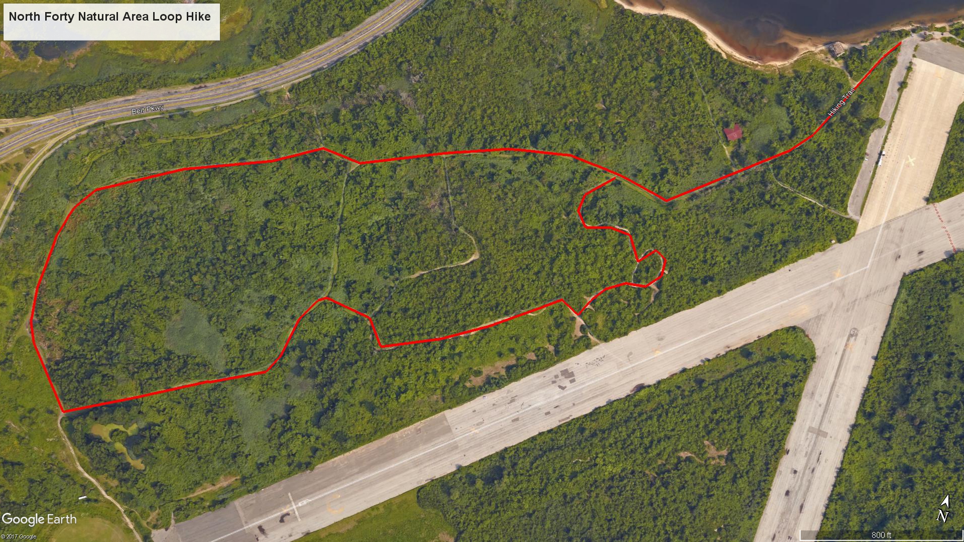 There are a number of non-named hiking trails that crisscross the North Forty Natural Area at the northwest side of Gateway National Recreation Area’s Floyd Bennett Field. None are particularly scenic or offer anything that pertains to history, so hiking them is for exercise purposes only. Though the trails are surrounded by vegetation, the trees are very short, so you will be exposed to the sun for most of the hike. Wear a hat and apply sunscreen if protecting yourself from the sun is important to you. There is also a healthy gnat population and a few mosquitoes, though gnats are a far bigger nuisance.